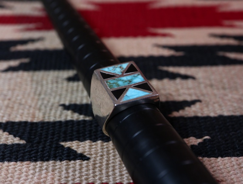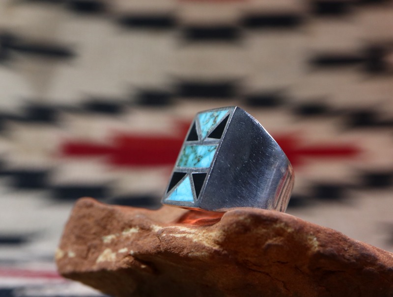 トラディショナルなズニジュエリーのデザインであり、独特な幾何学模様はネイティブ柄のアイテムとの相性も素晴らしく、インディアンジュエリーらしい雰囲気とエッジ―で現代的な印象を併せ持つリングとなっています。