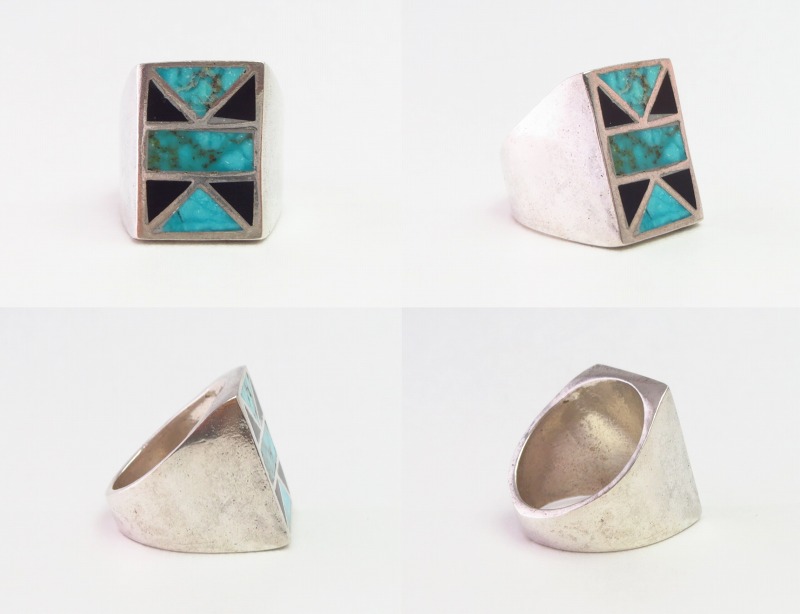 1960年代前後に作られた作品と思われ、キャストで成形されたスクエアフェイスのベースは、『シールリング』と呼ばれるクラシックで重厚な造形スタイル。そのフェイス部分は、幾何学模様を構成するように7分割され、美しいターコイズやソリッドなブラックのオニキスが螺鈿細工のようにピッタリとセットされています。