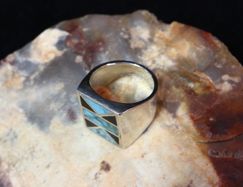【ZUNI】ズニのビンテージジュエリー、美しいターコイズとオニキスが幾何学模様を構成するようインレイされたシールリング/印台型タイプのアンティーク/ビンテージリングです。