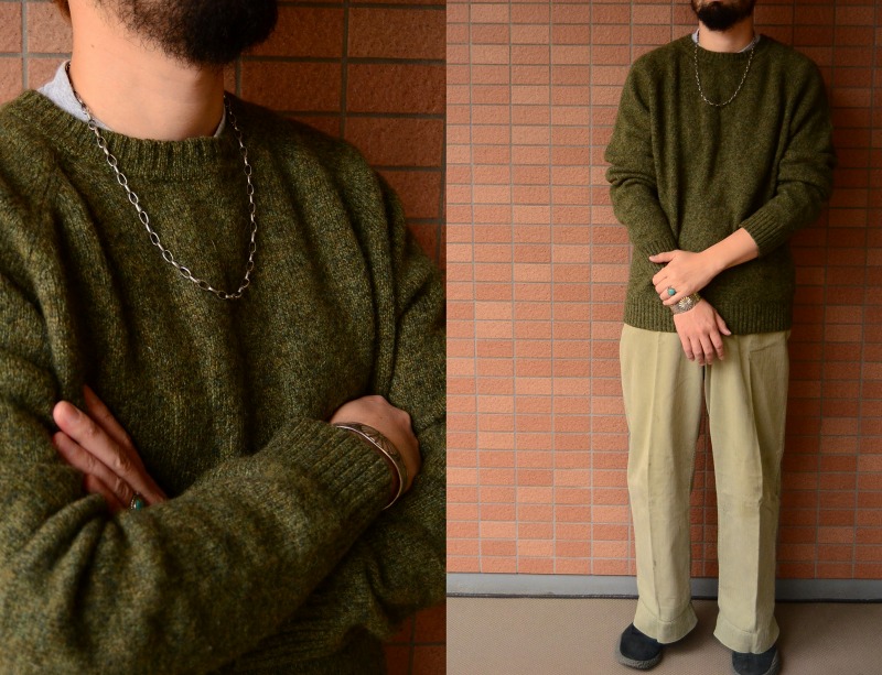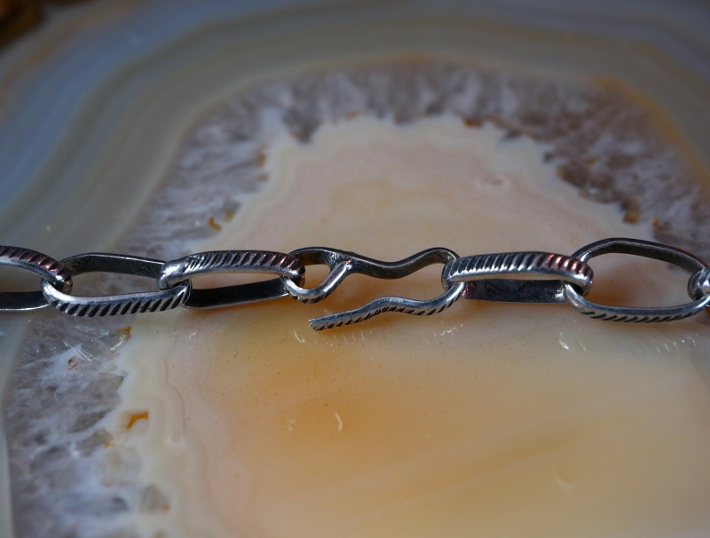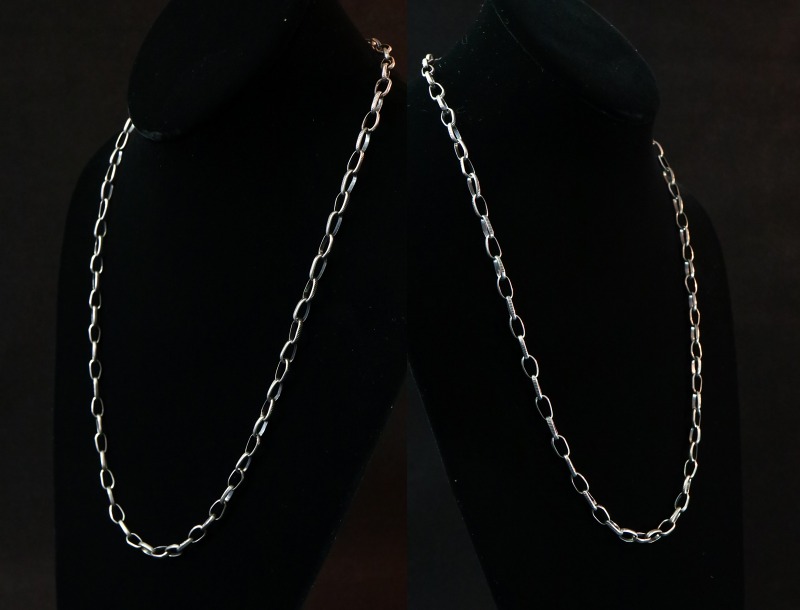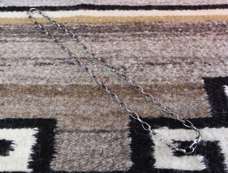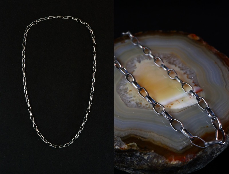 ハーフラウンドワイヤーに細かなスタンプが刻まれたコマを繋いで構成しています。このようなチェーンは、棒や細い板にシルバーワイヤーをコイル状に巻き付け、それをカットして一コマ一コマを丁寧にロウ付けし、つなぎ合わせることでチェーンにする手の込んだものです。本作では、細かなスタンプワークが複雑で渋い表情を生み出しており、ざらついた質感がビンテージインディアンジュエリー独特の雰囲気を醸しているようです。