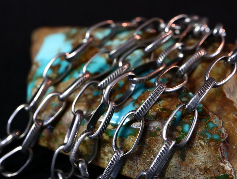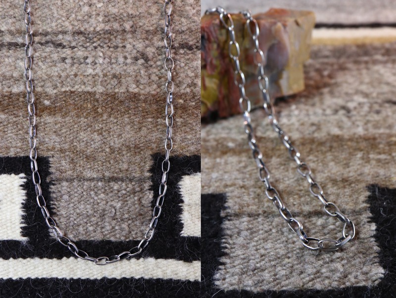 こちらのようなディテールを持ったチェーンは、【Cochiti】コチティの大巨匠【Joe H. Quintana】ジョー・キンタナ(1915-1991)の作品等でも発見されており、ナバホジュエリーに限らず作られていた造形スタイルとなっています。