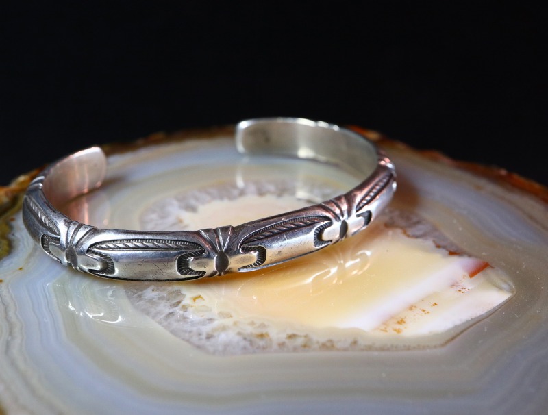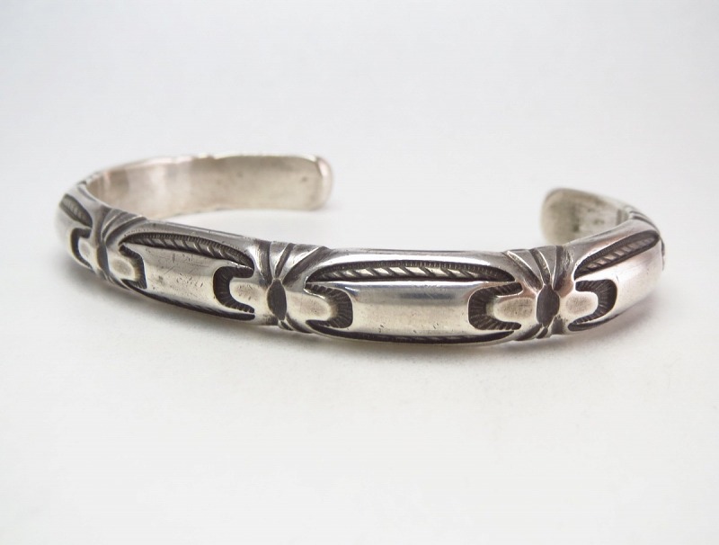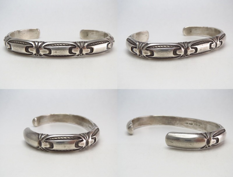 1940年代末~1960年代頃に作られた作品と思われ、インゴットシルバー(銀塊)からローラーで伸ばして成形することで、とても硬く心地よい重量感が与えられたハーフラウンドワイヤーのバンドをベースとした作品。そのフロントからサイドにかけてどこか構築的で独創性のあるスタンプワークがが力強く刻まれています。また、それらのスタンプワークによる文様と呼応して、『ファイルワーク』と呼ばれるヤスリによる立体的な刻みが施されており、作品に動きとコントラストを与えているようです。これらのシルバーワークはどれもプリミティブで伝統的なな技術となっていますが、その仕上がりはどこかモダンで現代的な表情を持っています。