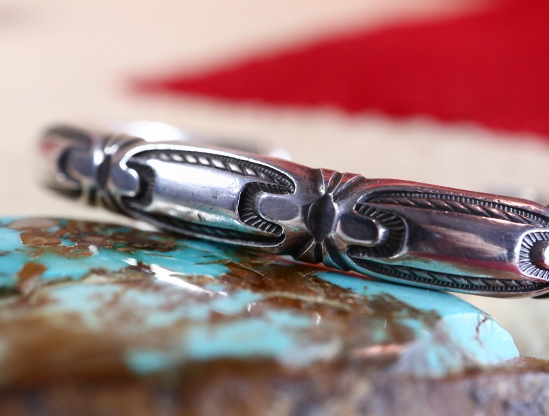 また、これら『スタンプワーク』は、スタンプ/鏨ツールを打ち付けることによってシルバーに文様を刻みこんでいますが、そのツール(鏨)はシルバーよりも硬い鉄(鋼)で作られています。その為、その加工はジュエリー制作よりもはるかに高い難易度となります。また、ナバホジュエリーにおけるスタンプワークは、古くからその根幹を成す技術の一つであり、シルバースミスの「技術力」は、スタンプツールを制作する「技術力」次第であり、優れたシルバースミスは、優れたスタンプメーカーと同義です。また、スタンプのクオリティは現代作品とビンテージ作品を見分ける上でも大きな特徴となります。1950年代以前の作品で見られる1920年代~1940年代に作られたスタンプツールの多くは、本作と同様に非常に細かな文様を刻むことが出来る高い質を持つことが特徴となっています。残念ながら、現在では多くのシルバースミスが市販されているスタンプツールを使用しており、ハンドメイドのスタンプツールを使用している作家やスタンプツール自体を制作する作家は限られた存在となっています。