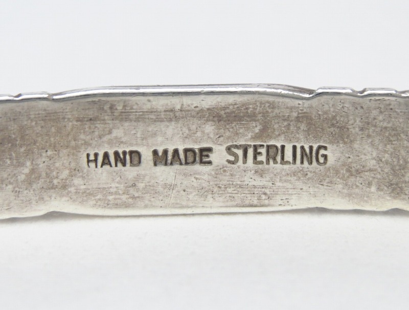 内側には925シルバー製であることを表す『STERLING』の刻印と共に『HAND MADE』の刻印が施されています。この『HAND MADE』のスタンプによって1930年代後半~1950年代に、ツーソン、ギャラップ(アリゾナ州)~サンタフェ、アルバカーキ(ニューメキシコ州)のアメリカ中西部に誕生した多くのインディアンジュエリーショップの中でもいくつかのショップ/工房が推測されます。