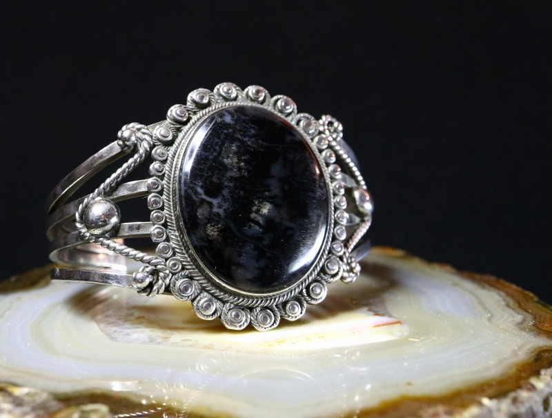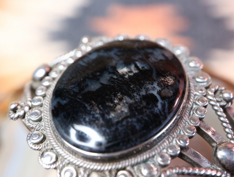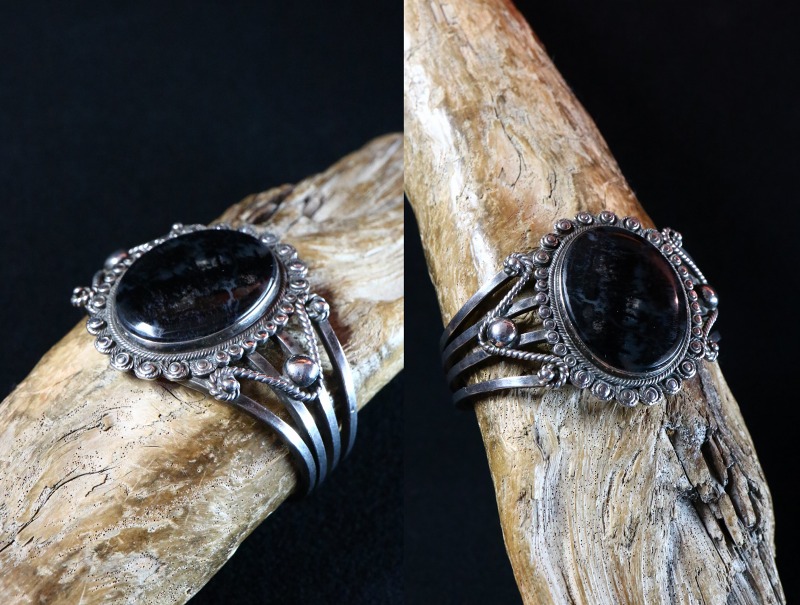 【NAVAJO】ナバホ/【PUEBLO】プエブロのアンティークジュエリー、深く強いブラックを基調とした【Petrifiedwood】ペトリファイドウッド(木の化石)がセンターにマウントされた作品で、とても丁寧で手の込んだシルバーワークによって造形されたアンティーク/ビンテージバングルです。