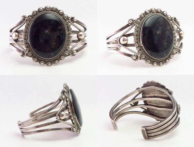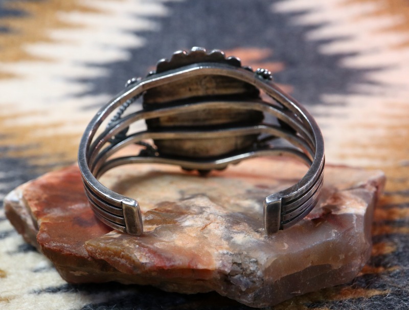 1940年代後半~1950年代頃の作品と思われ、インゴットシルバー(銀塊)より成形された4本のスクエアワイヤーを重ね、フロントを広く造形することでスプリットバンドのような造形スタイルとなっています。そのセンターには『スキャロップドエッジ』(ホタテ貝)とも呼ばれる細かな動きのあるエッジに造形されたオーバルシェイプに大きさのあるペトリファイドウッドがマウントされ、そのベゼル(覆輪)にはスクエアワイヤーを単独で捻ることで作り上げたツイステッドワイヤーが配されています。さらに、その外側には小さなコンチョが大変細かく羅列されており、それらも上下の一部にはツイステッドワイヤーによって囲みこまれています。フェイスの両サイドにはツイステッドワイヤーとシルバーボールを用いた装飾が施されており、派手さはありませんが非常に手の込んだ細工によって構成され、作者の高い技術力も感じられる作品となっています。