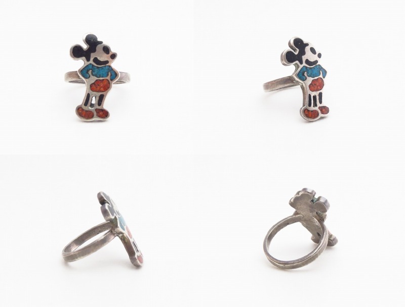 【ZUNI】ズ二か【NAVAJO】ナバホの作品で、『チップインレイ』と呼ばれる破砕した石を樹脂と共にインレイすることで構成されたミッキーマウスモチーフの作品。キャッチーでポップな表情が可愛いビンテージリングです。