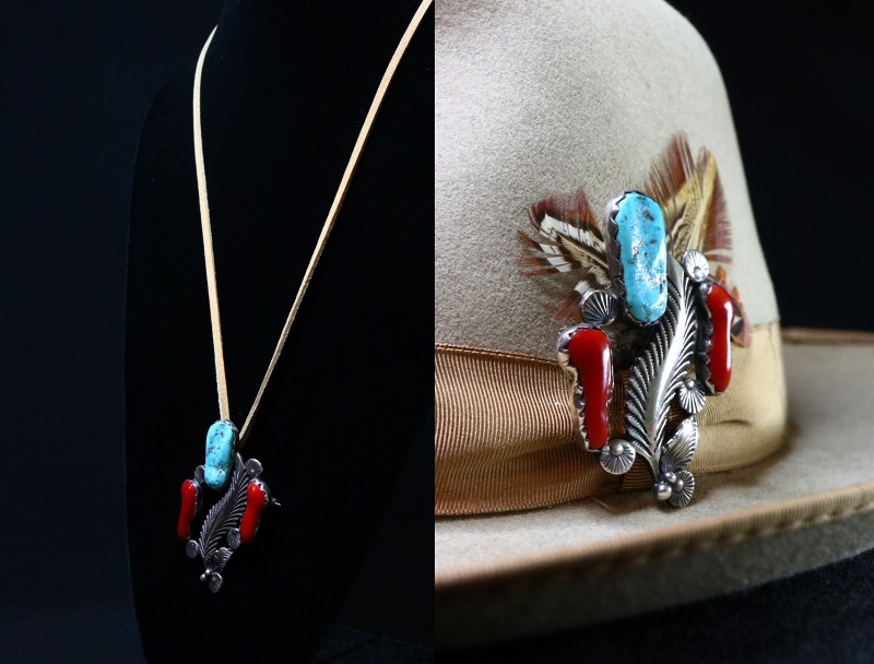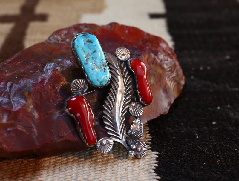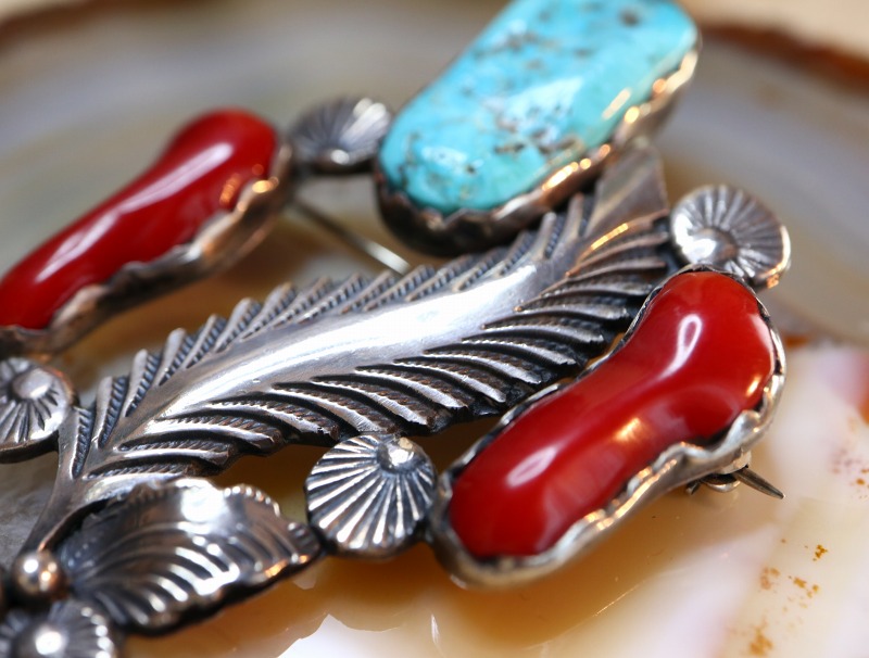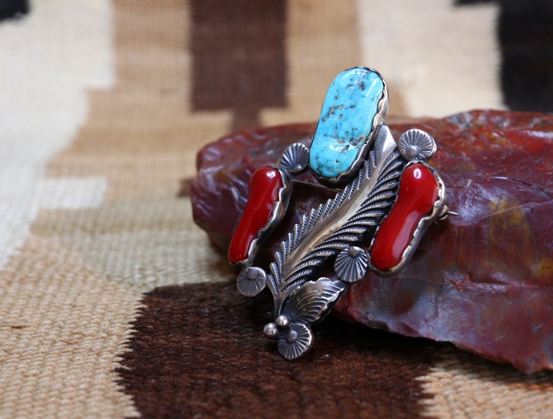 コーラルによる華やかさとインディアンジュエリーらしい素朴でナチュラルな質感を併せ持ち、ラフでありながら繊細な表情という二面性を感じさせる作品に仕上げられています。