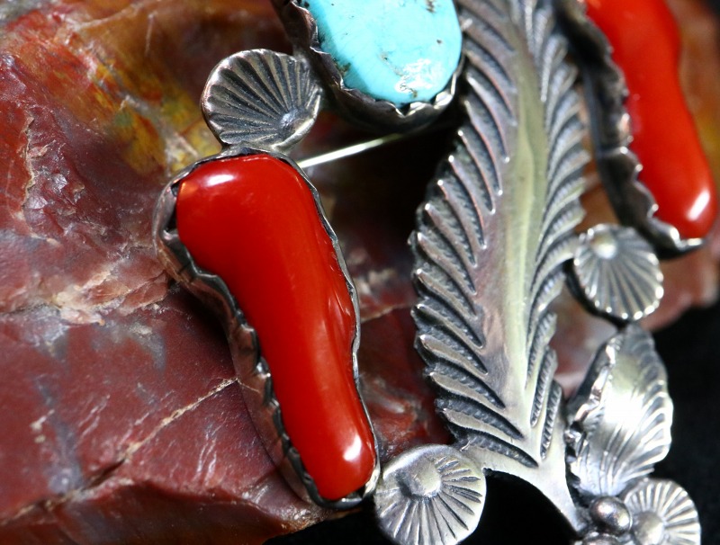 中央に大きなリーフデザインを置き、ターコイズと2つのコーラルを躍動的に配しています。そして、小さなコンチョパーツやリーフのアップリケによってそれらを巧みに繋ぎ合わせており、土台となっているベースは丁寧にカッティングされることで、それらの間には大きく空間が設けられています。手間の掛かるディテールですが、それらの空間によってダイナミックで立体的な造形でありながら洋服等にとても馴染みやすくなっています。また、同作者が生み出したとされるディテールであるナチュラルなシェイプを生かしたラフカットコーラル/珊瑚が華やかな表情を与えるアクセントとなっています。石のベゼル(覆輪)もハンドカットによるノッチドベゼルとなっており、細部まで流麗で有機的な造形にフィットするように手の込んだシルバーワークによって構成されています。