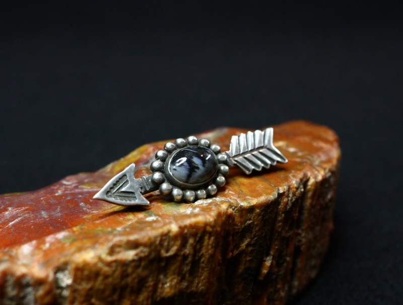【Tourist Jewelry】ツーリストジュエリーや【Fred Harvey Style】フレッド・ハービースタイルと呼ばれる、20世紀前半頃にアメリカ中西部の観光客向けに制作されたスーベニアアイテム(土産物)の一つ。小さなアローシェイプをベースに、深いグレーとブラックを基調とした怪しげな【Petrifiedwood】ペトリファイドウッド(木の化石)がマウントされたアンティーク/ビンテージピンブローチです。