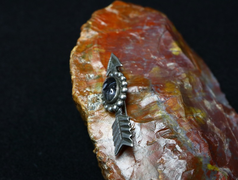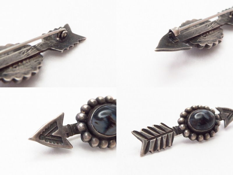 1940年代~1950年代前半頃に作られたと思われる小さなピースで、フレッド・ハービースタイルを代表する工房の一つである【Maisel's】製と推測されます。アローシェイプ等、スーベニアアイテムらしいデザインのピンですが、武骨なシルバーワークや妖艶な魅力を持つペトリファイドウッドによってアンティークピース独特の味わいが与えられています。