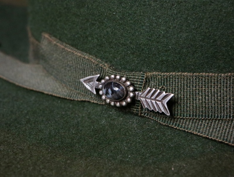 こちらの作品の小さなサイズ感やビンテージアイテムと大変相性の良いアローシェイプは、多くのスタイルにフィットさせることが出来る汎用性を持っており、アウターのアクセントととして、ラペルや襟等にもフィットしますし、ハット等のワンポイントにも使い勝手の良いピースです。