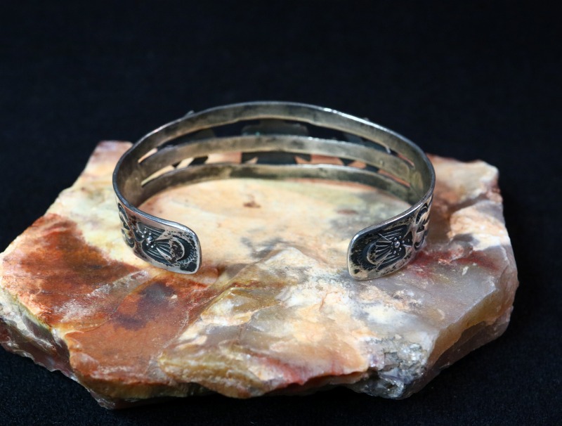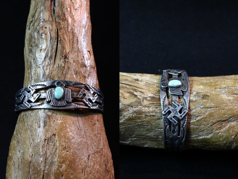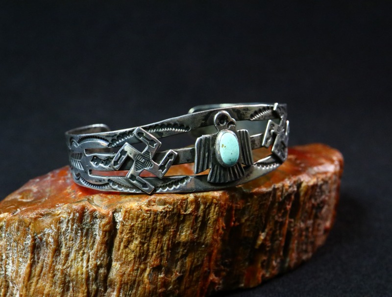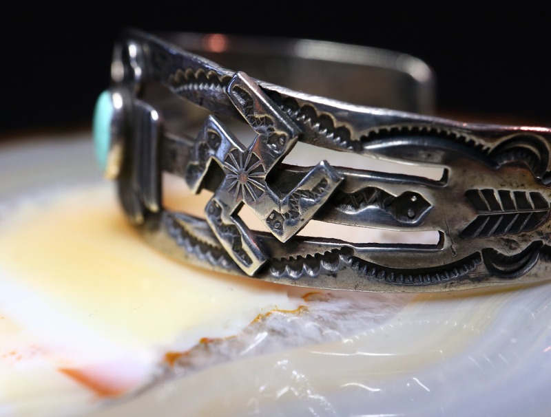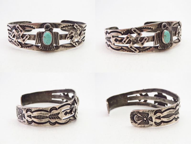 ツーリストジュエリーのオーセンティックなモチーフや構成となっていますが、それらの中では比較的しっかりとした造りのピース。さらに、バンドのサイドからターミナル(両端)にかけてもアローやスネーク等のスタンプワークが配され、ターミナルにはキャッチーで質の高いサンダーバードのスタンプとなっています。
