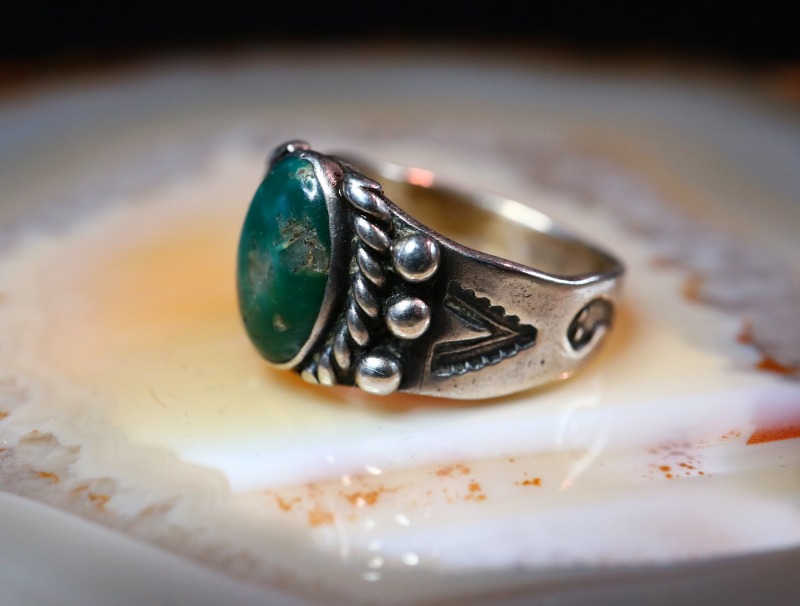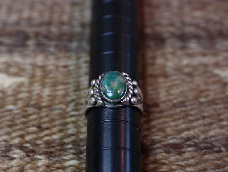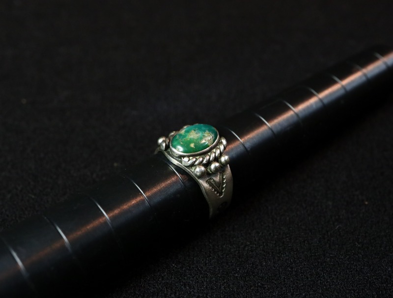 【NAVAJO】ナバホのアンティークジュエリー、【Fred Harvey Style】フレッド・ハービースタイルや【Tourist Jewelry】ツーリストジュエリーと呼ばれる20世紀前半頃にアメリカ中西部の観光客向けに制作されたスーベニアアイテム(土産物)の一つで、綺麗なグリーンターコイズのセットされた小さいサイズのアンティーク/ビンテージリングです。