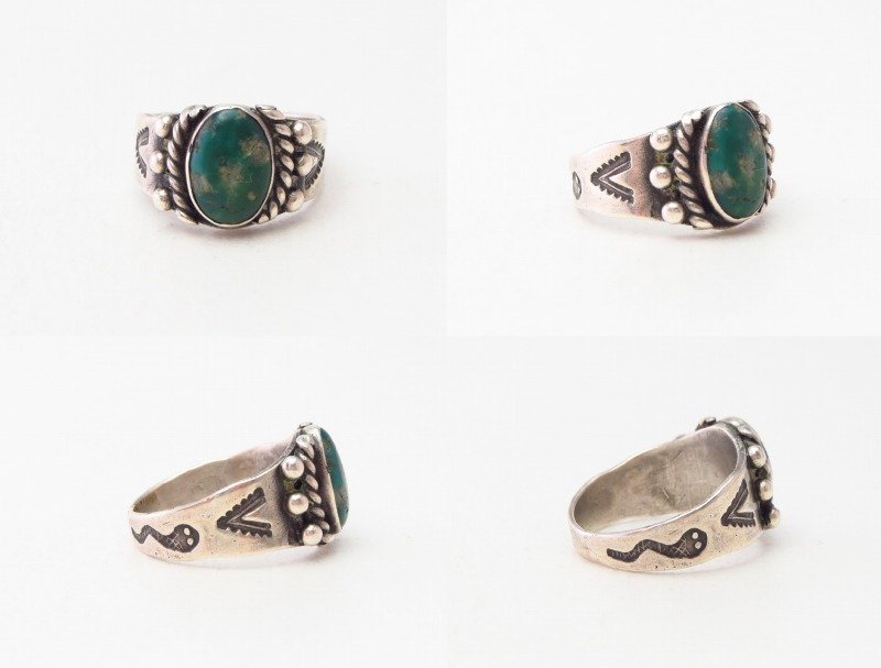 1920年代末頃~1940年代製と思われ、ツーリストジュエリーの中では比較的厚みと重量感のあるシャンク/地金をベースは、センターに向かって幅が少し広くなったシェイプとなっています。そしてそのセンターには、カボションカットされた綺麗なグリーンターコイズがセットされており、そのベゼル(覆輪)の両脇には2本のワイヤーを撚り合わせて作られたツイステッドワイヤーが施されています。さらに、その外側にシルバーボール/ドロップが3つずつ配され、シャンクには力強く深いスタンプワークが刻まれています。両サイドのスタンプは、スネーク/ガラガラ蛇モチーフとなっており、クラシックなデザインにツーリストジュエリーらしいキャッチーな印象を与えています。