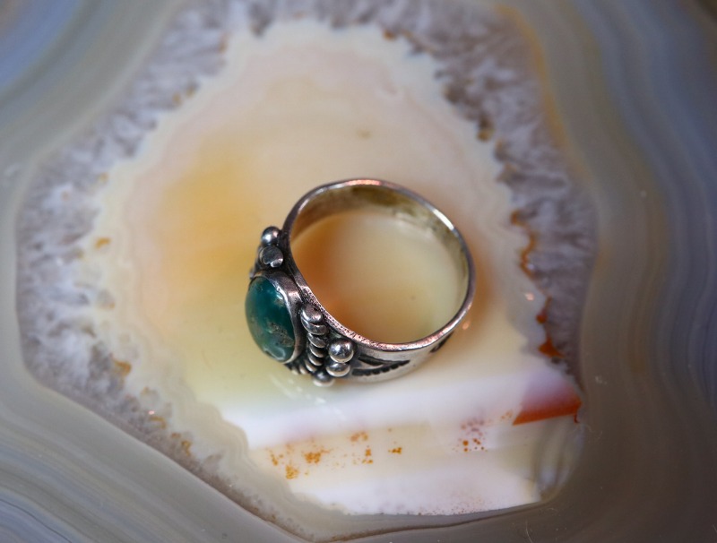 伝統的なシルバワークやクラシックな印象のターコイズによって奥行きを持ったリングとなっており、多くのスタイルにナチュラルに馴染みやすく女性だけでなく男性のピンキーリングとしてもフィットするリングです。手に馴染みの良いシェイプは仰々しい印象が無く、多くのスタイルに溶け込みます。