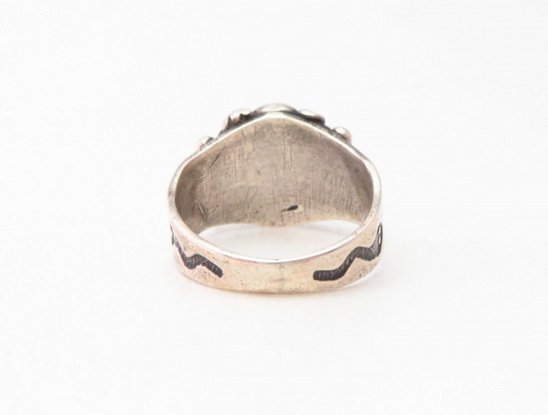 ツーリストジュエリーながら経年による独特の迫力を持ち、オーセンティックなビンテージインディアンジュエリーの魅力と秀逸な造形美を感じることが出来るアンティークリングです。
