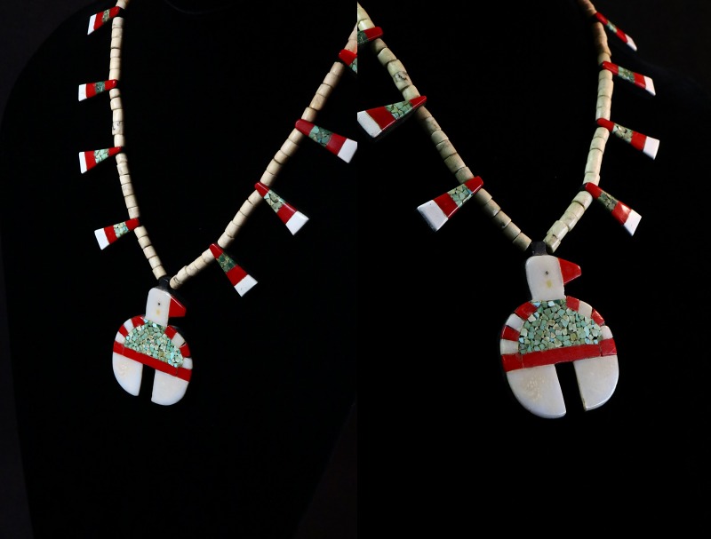 1930年代の同じような素材を用いたキワ族の作品において、ナジャモチーフのネックレスはいくつか発見されており、その数は非常に少ない為、多くがミュージアムに収蔵されています。本作は、ナジャそのものではなく、サンダーバードとナジャを組み合わせたオリジナリティ溢れる造形となっており、大変貴重なピースとなっています。