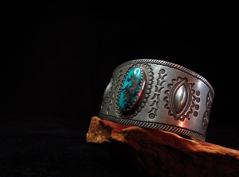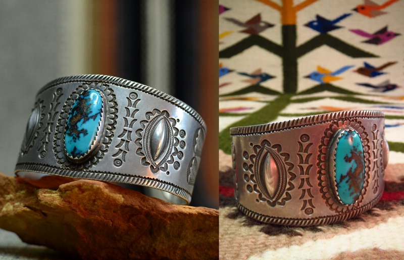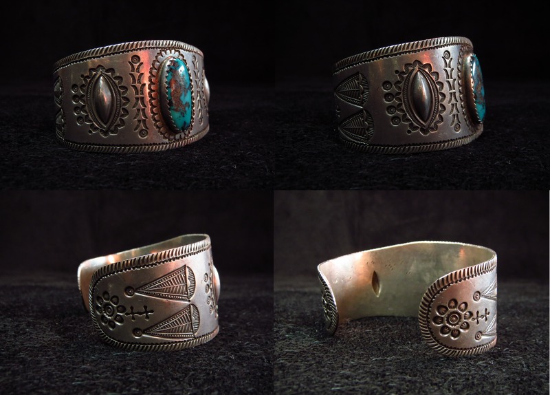 ブレスレットやリングなど、トラディショナルなナバホスタイルを踏襲した作品が多く見つかっていますが、ボックスやカトラリー等多岐にわたるシルバー作品を残しており、伝統的な技術を踏襲しながらも新しいスタイルや実験的な造形のピースも見られ、そのクリエイティブな作風や美意識は後世の作家にも多くの影響を与えています。さらに、1941年発足の職人団体【The Navajo Arts & Crafts Guild】 ナバホギルドのメンバーとしてもその名前が残されています。