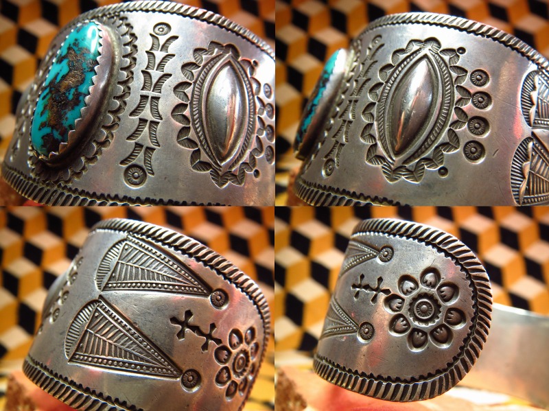 センターには美しいロイストンかブルーダイヤモンドと思われるターコイズがセットされ、エッジ部分は丁寧にチゼルワークが施されています。