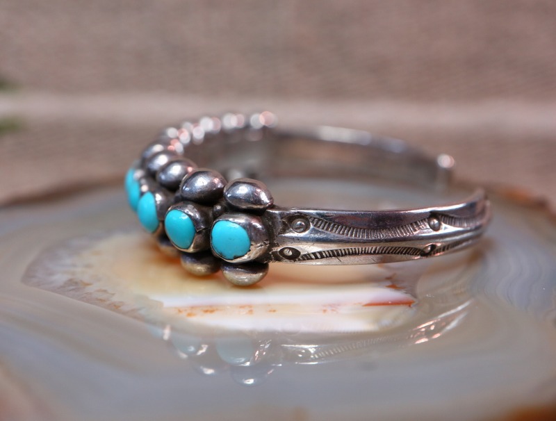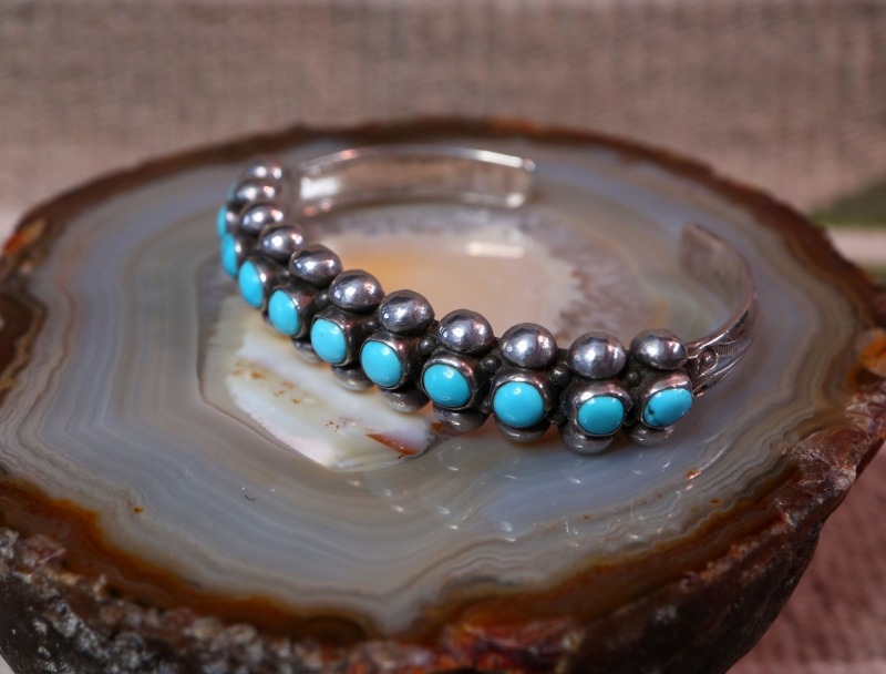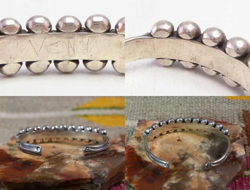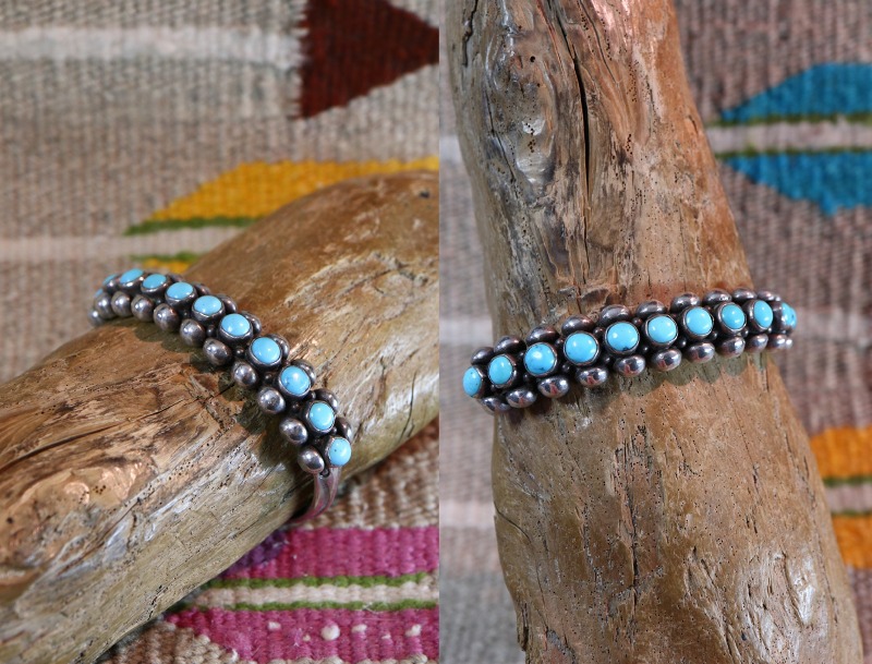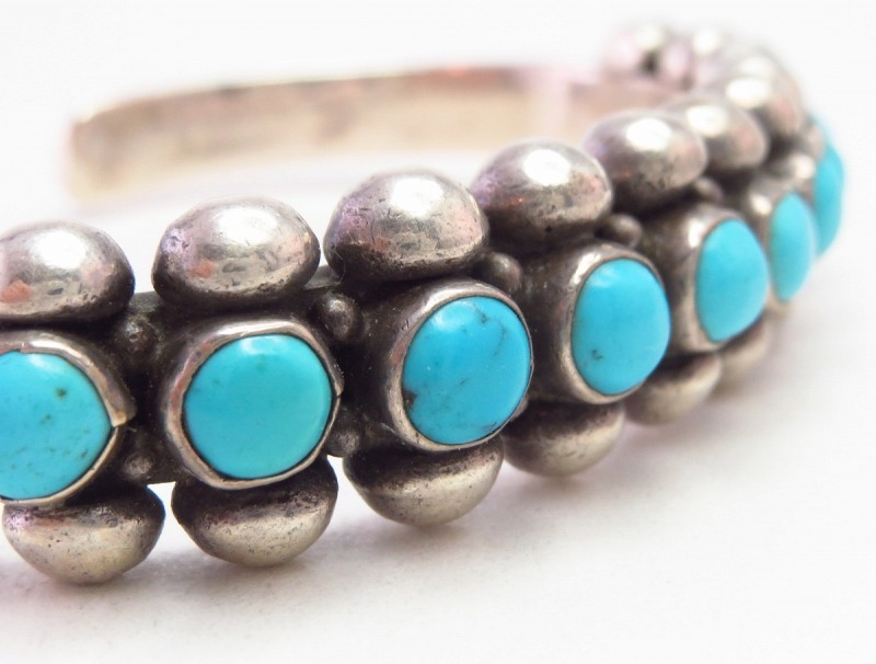 1920年代後半~1930年代頃に作られたと思われる作品で、小さなターコイズを細いバンドに羅列する造形スタイルは、古くからズニ族のジュエリーにおいて多く見られるスタイルですが、本作はシルバーワークのディテールやマウントされたターコイズのサイズ等からナバホのシルバースミスによって制作された作品と思われます。
