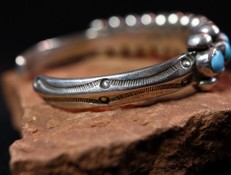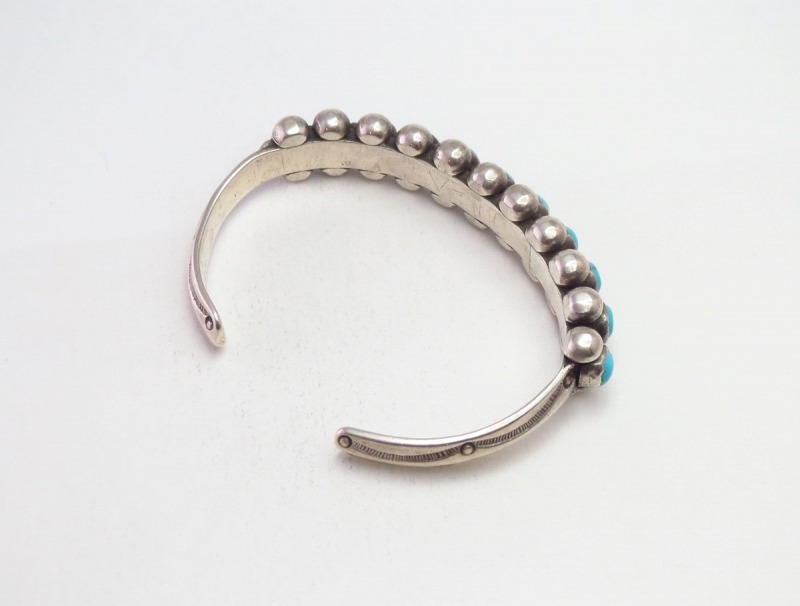 【NAVAJO】ナバホのアンティークジュエリー、インゴットシルバー(銀塊)から成形された重厚なトライアングルワイヤー(竜骨型)をベースに、11個のターコイズが羅列された『ローワーク』と呼ばれる造形スタイルの作品。それらの上下には大きさのあるシルバーボールが精密に配されており、細部まで丁寧に仕上げられたハイエンドなアンティーク/ビンテージバングルです。