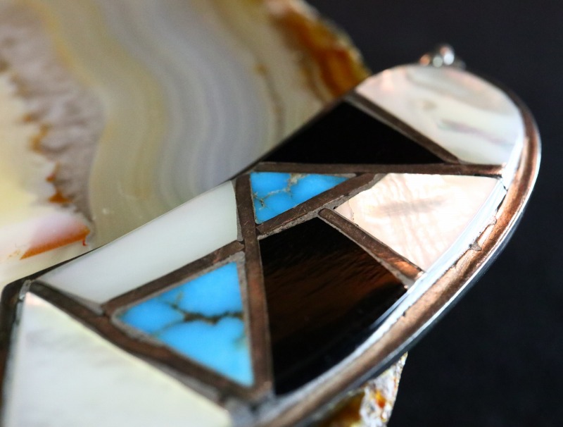 こちらの作品もズニの伝統的なインレイ技術とシルバーワークによって構成された作品ですが、その洗練されたカラーリングと繊細な仕事によってグラフィカルでモダンな表情も持った作品に仕上がっています。