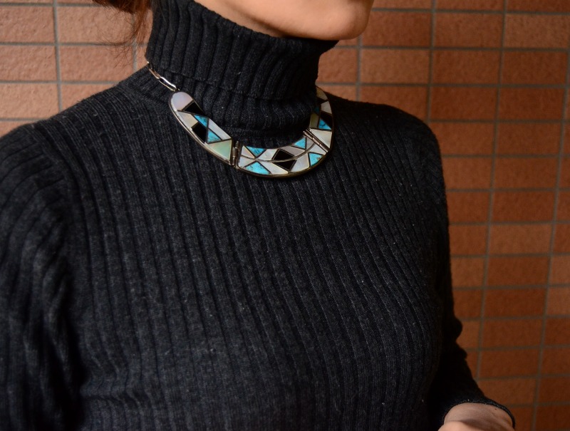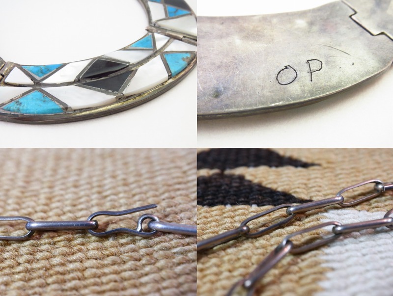 1970年代頃に作られたピースと思われ、裏面には『OP』の文字が刻まれていますが、その作者は不明となっています。Uシェイプの重厚なプレートとハンドメイドで作られたチェーンで形作られたネックレスとなっており、プレート部分には、マザーオブパール(シェル)やターコイズ、オニキスが少し厚みを持たせ立体的にインレイされています。そのモチーフは不明ながら、三角形や台形で生み出されている幾何学模様は不思議な魅力を持ち、直線的でありながらどこか有機的でナチュラルな表情が与えられています。