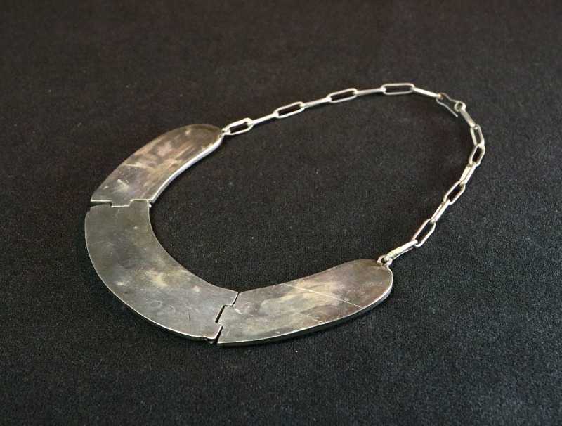 さらに、センターとサイドのプレートをヒンジ/蝶番が繋ぐことで、デコルテの微妙な曲面に添うように造形されており、手の込んだ設計やシルバーワークからは、作者の拘りと確かな技術が感じられます。