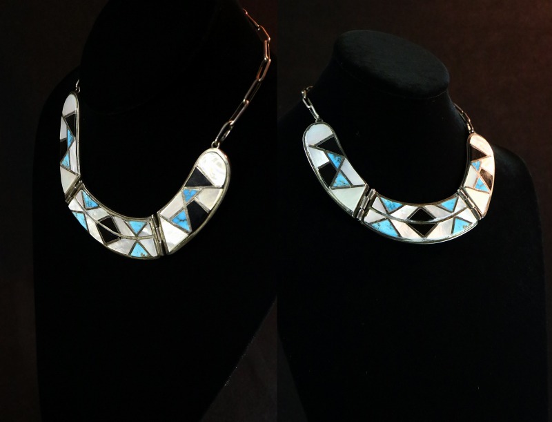 【ZUNI】ズ二のビンテージジュエリー、マルチストーンインレイワークによって構成されたブレストプレート/ビブネックレスタイプの作品。ズニらしい美しい色彩と独特の幾何学模様が印象的なビンテージネックレスです。