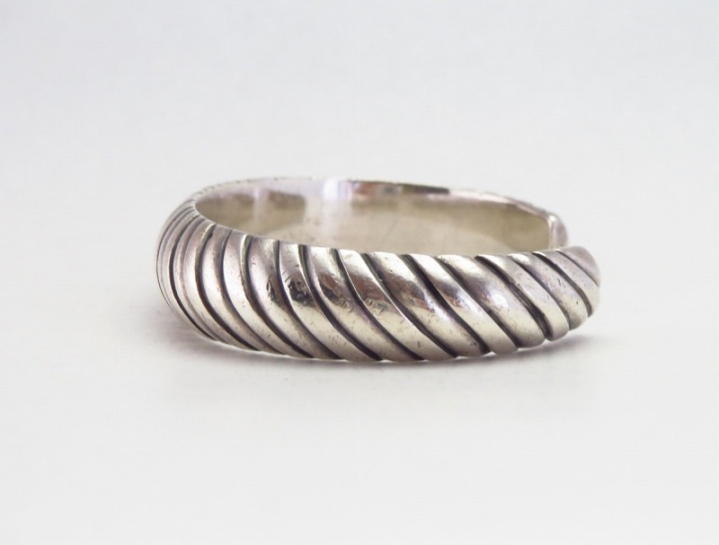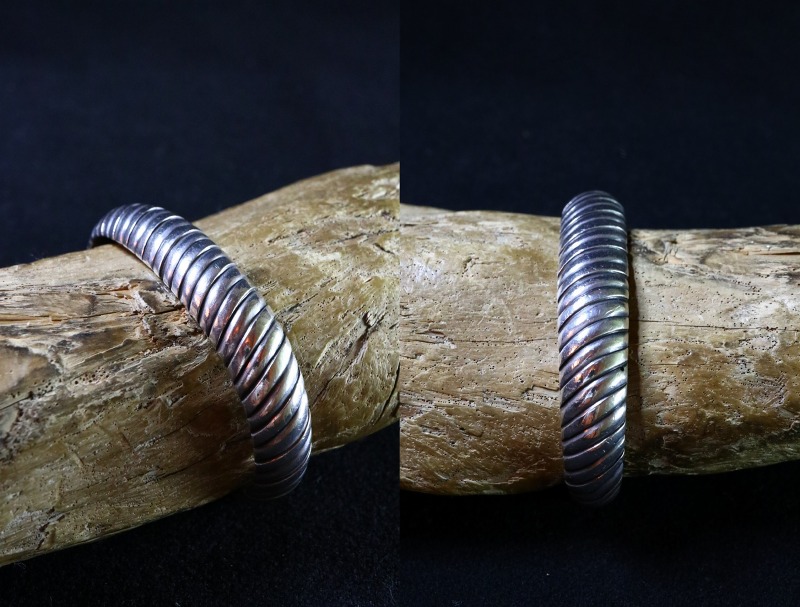 【NAVAJO】ナバホのアンティークジュエリー、ファイルワークという原始的な技術によって立体的なバイアス模様が構成された非常にシンプルな作品。ミニマルなデザインながらプリミティブで大変な手間の掛る製法によって造形され、重厚に仕上げられたアンティーク/ビンテージバングルです。