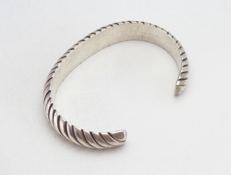 また、ホールマーク(作者のサイン)等が刻印されていない為、正確に作者や背景を特定することは出来ませんが、バンドの独特なシェイプや造形スタイル等から【The Navajo Arts & Crafts Guild】 (NACG)=通称『ナバホギルド』で制作された物と推測される作品です。