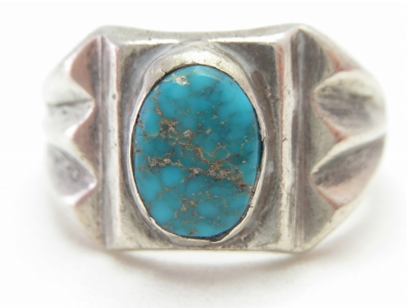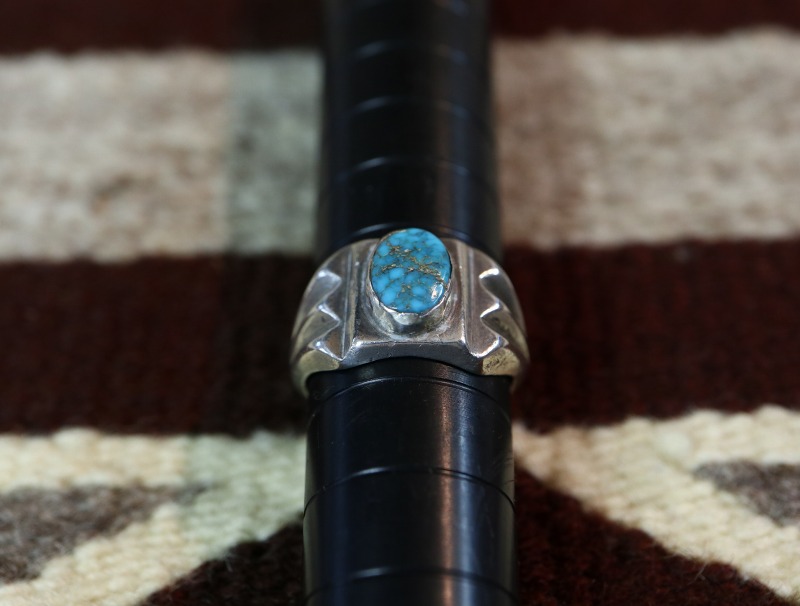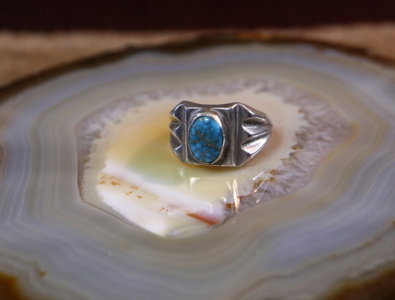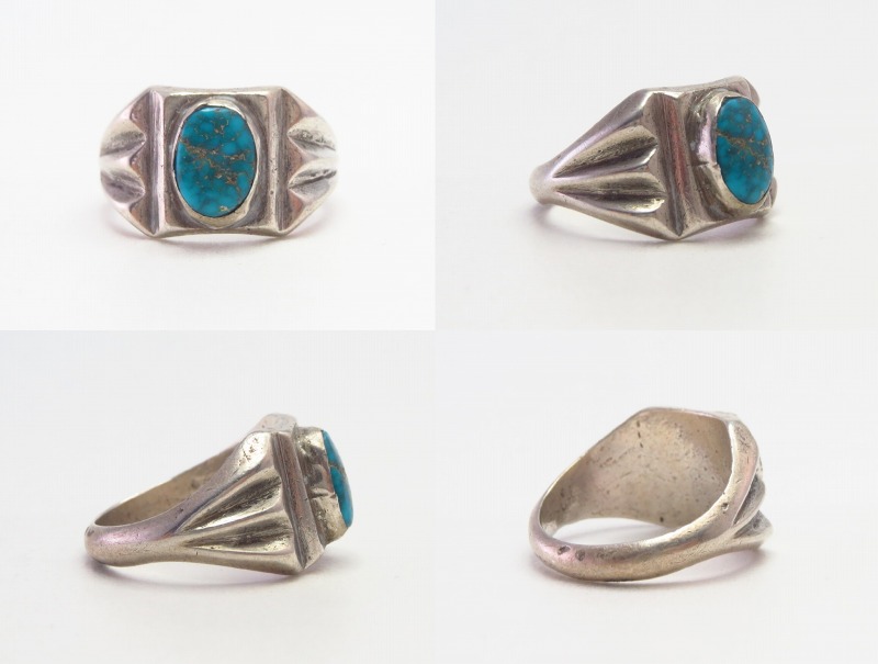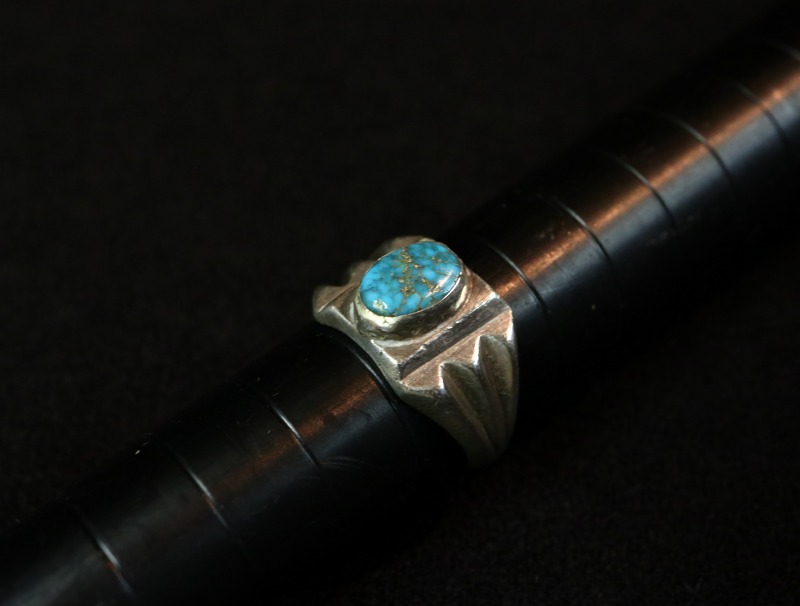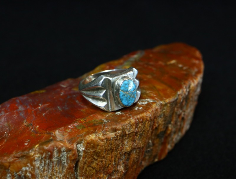 古い作品から外された石のため、鉱山の特定は非常に困難ですが、おそらく【Old Burnham Turquoise/Godber Turquoise】バーナム/ガドバーターコイズか【Lone Mountain Turquoise】ローンマウンテンターコイズと思われます。現在も美しい色相を保ち、シンプルな造形のリングに良く馴染むジェムクオリティターコイズとなっています。
