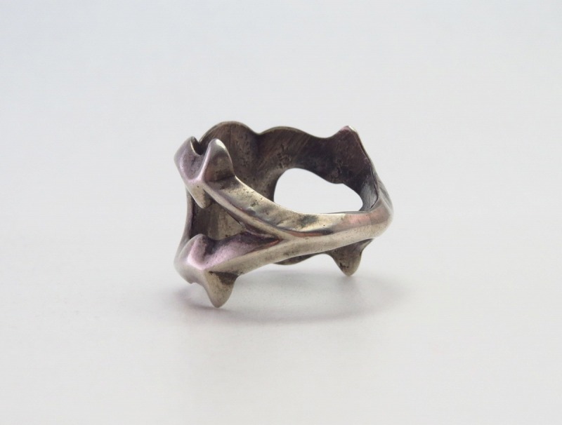 本作の場合は、厚くエッジのしっかりとした造形となっており、多く制作された『型』によるピースではなくオリジナリティを持った作品となっています。また、おそらくフロントの中心で左右が別々に作られて、後からロウ付けして形作られており、そのような製法も1960年代以前の作品で多くみられる造形方法となっています。それらのディテールからは、1940年代~1960年代頃に制作された作品であることが推測されますが、断言することは出来ません。