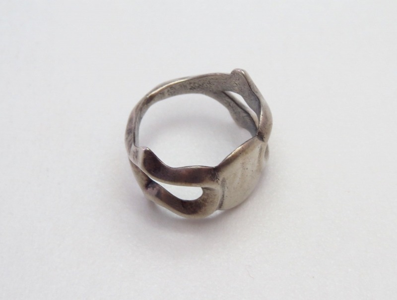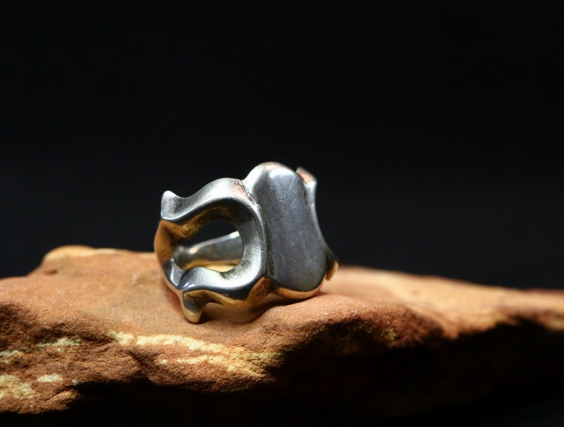【NAVAJO】ナバホのビンテージジュエリー、サンドキャストで成形された作品で、ブランクとなったシンプルなフェイスデザインとサイドにかけての流麗な造形で構成された作品。伝統的なサンドキャストで作られていますが、量産されたのもではなく、オリジナリティも感じさせるアンティーク/ビンテージリングです。
