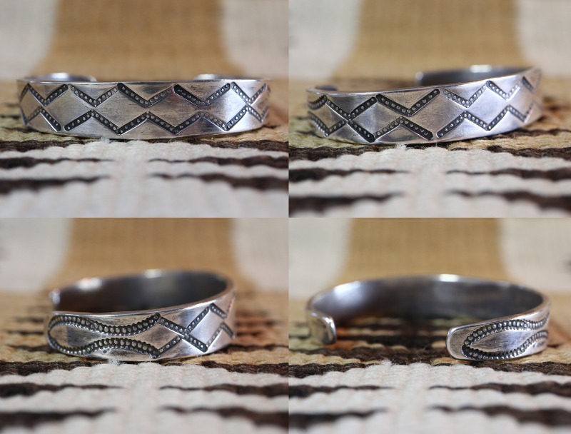 製法やディテールから、おそらくナバホのシルバースミスによる作品と思われますが、シンプルなスタンプワークの構成はプエブロ(ナバホ以外のアメリカ中西部に起源を持つインディアン部族) の作品も想起させる雰囲気を持っています。