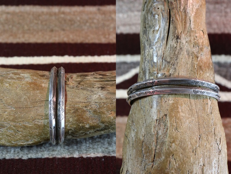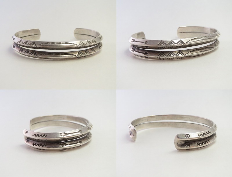【NAVAJO】ナバホのアンティークジュエリー、アロー等のナバホジュエリーらしいスタンプワークが施されたナローなトライアングルワイヤー(竜骨型)のバンド/地金を2連に構成したアンティーク/ビンテージバングルです。