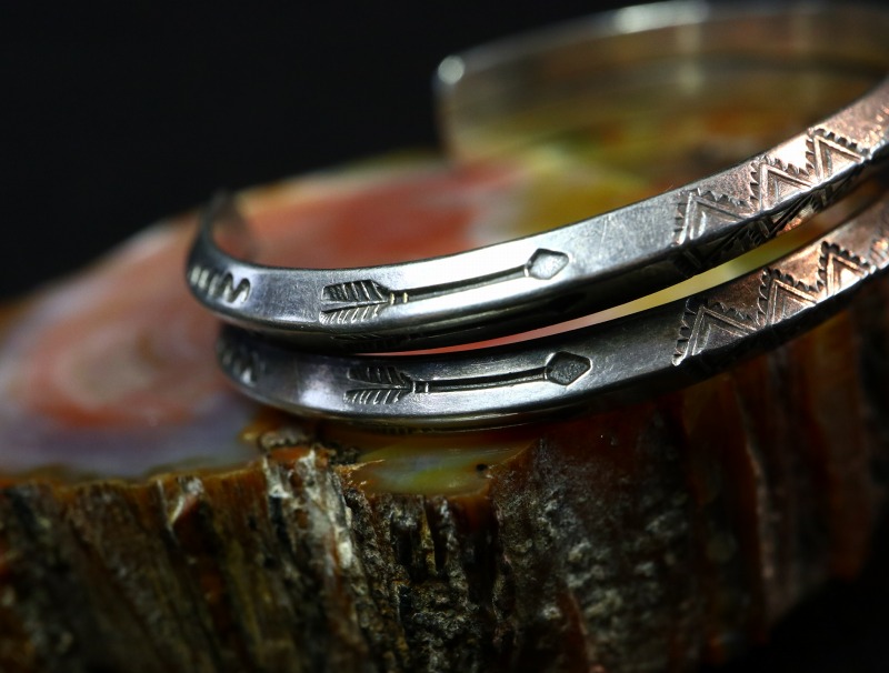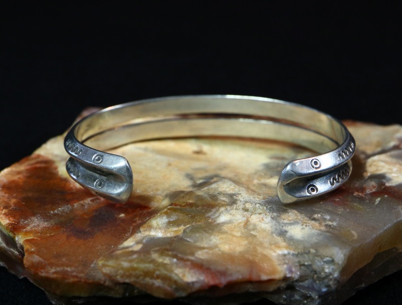 本作もアローのスタンプ等、ナバホの伝統的でオーセンティックなモチーフや技術、造形スタイルによって形作られた武骨な雰囲気を持つ作品。しかしながらトライアングルワイヤーの持つエッジーな印象やセンスの良いスタンプワークの構成により、シンプルでシックな印象を併せ持っており、あらゆるスタイリングにフィットする汎用性を持ったバングルです。