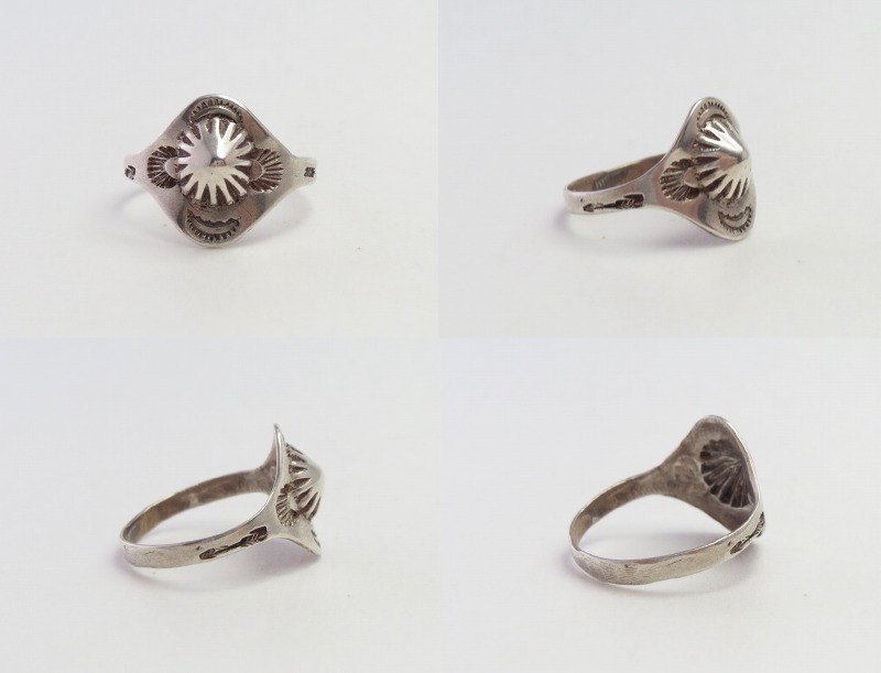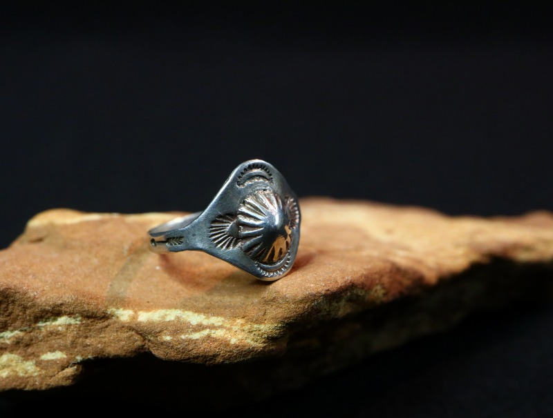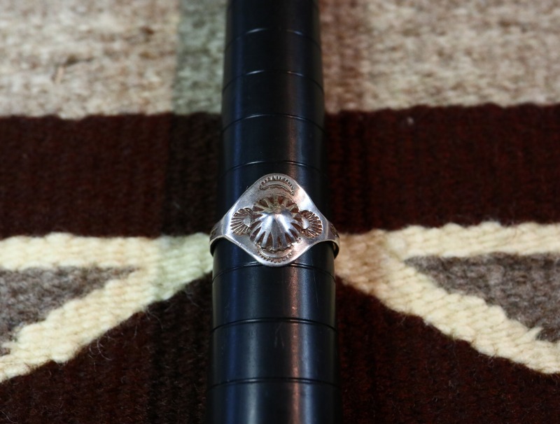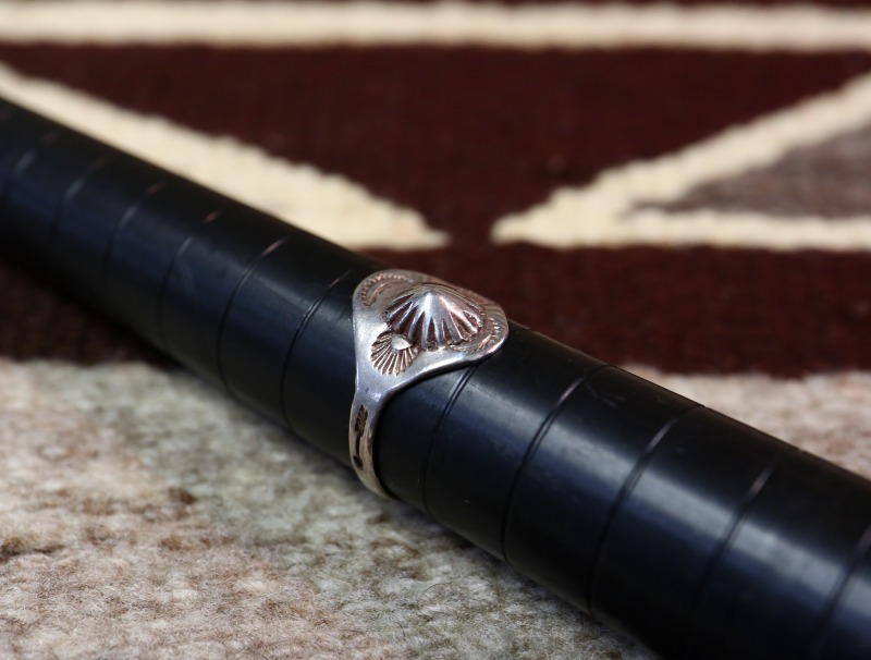 【NAVAJO】ナバホの【Fred Harvey Style】フレッド・ハービースタイルや【Tourist Jewelry】ツーリストジュエリーと呼ばれる20世紀前半頃にアメリカ中西部の観光客向けに制作されたスーベニアアイテム(土産物)の一つ。オーセンティックなシガーバンドシェイプをベースに、フロントにはシェルコンチョのリポウズ/バンプアウトが施され、サイドにはアローのスタンプワークが刻まれたアンティーク/ビンテージリングです。