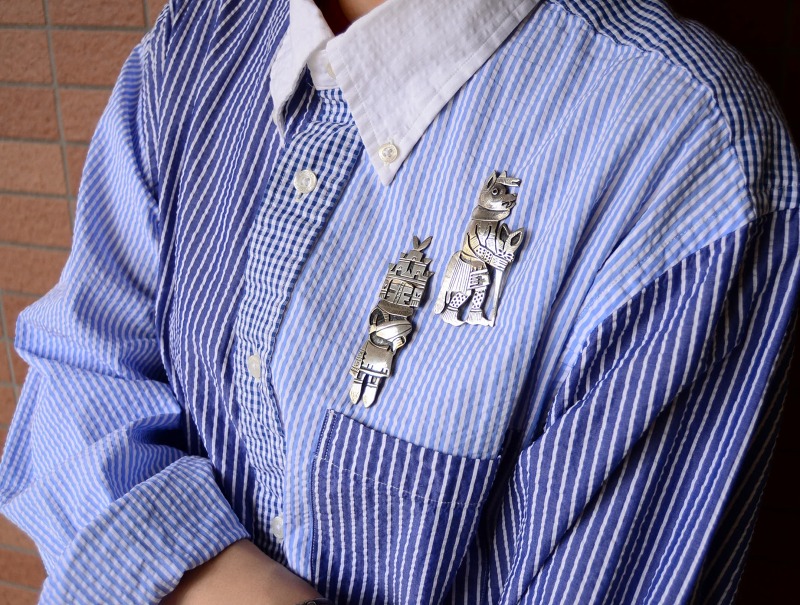 仕上げ工程では、ハンマーワークにより立体的な膨らみを持つ有機的で美しい曲線・曲面が与えられており、それによる立体感や柔らかな曲面は作品に上質感を与え、全体に高い完成度と重厚感のあるピンブローチとなっています。さらに、タブレータと呼ばれる頭部の装飾部分には、帽子のつばのようなパーツが垂直方向に造形されており、それらの立体的なシルバーワークや、カチナのどことなく厳かな表情により、へミスカチナの威厳と迫力が宿っているように感じられます。