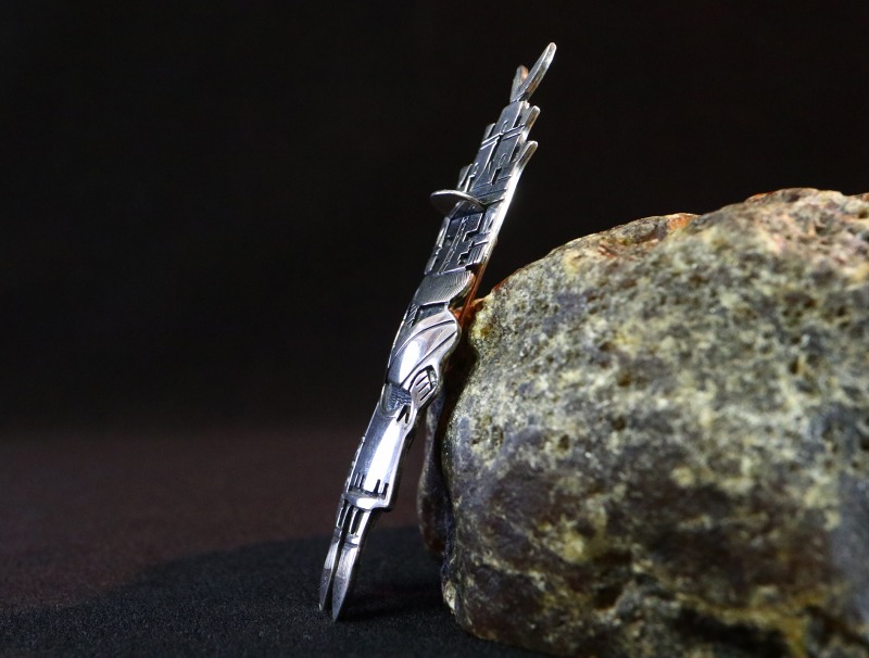 細かく丁寧なオーバーレイやスタンプワーク、動きと奥行きを生み出すハンマーワーク等、どれも作品に欠かせないシルバーワークであり、カチナというホピの神々/精霊をモチーフにする気概と愛情が感じられる作品となっています。