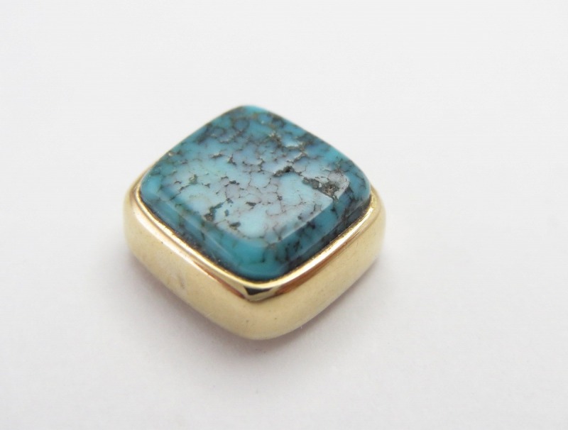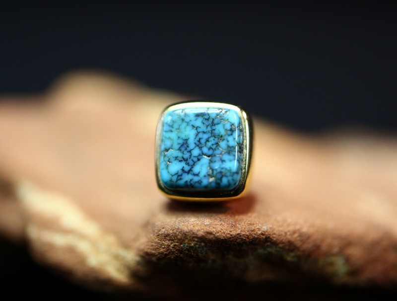セットされたターコイズは、Charles Lolomaが最も好んだ【Lone Mountain Turquoise】ローンマウンテンターコイズです。ゴールドと素晴らしい相性を見せる柔らかくも強いブルーの色相を持つ石であり、透明感のある濃い青にローンマウンテンらしいとてもタイトなウェブが入ります。また、長い時間を経た現在も艶を失わず高い硬度と質を感じさせ、小さな石ながらハイグレードにグレーディングできるローンマウンテンターコイズです。