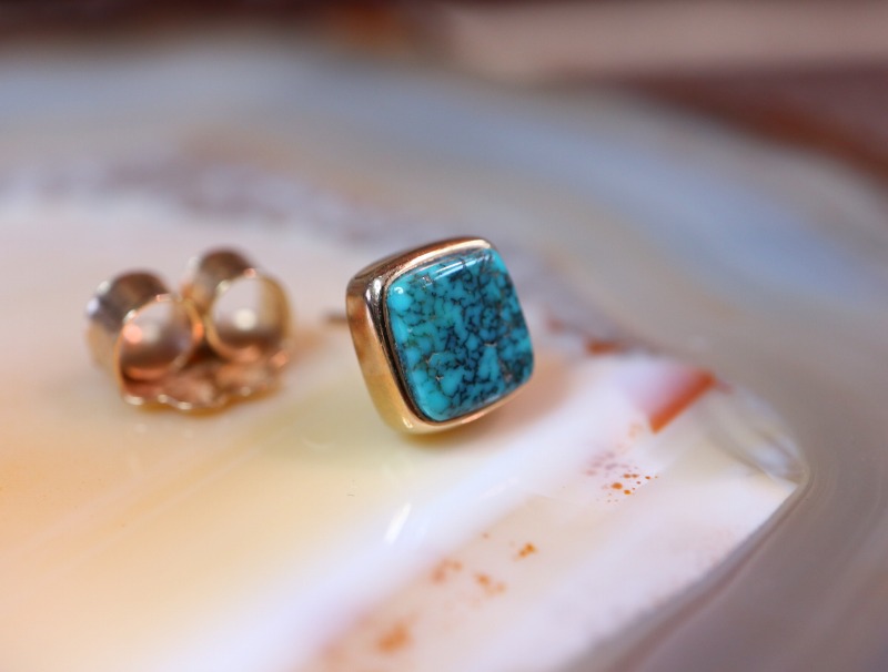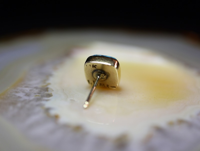 非常にシンプルでミニマムなピアス。素朴ながらゴールドによりジュエリーとしての品位が与えられており、多くのスタイルに馴染みやすい印象ながら、宝石として煌めくターコイズは日常にさり気なくも奥行きを与えるアクセントになり得ます。