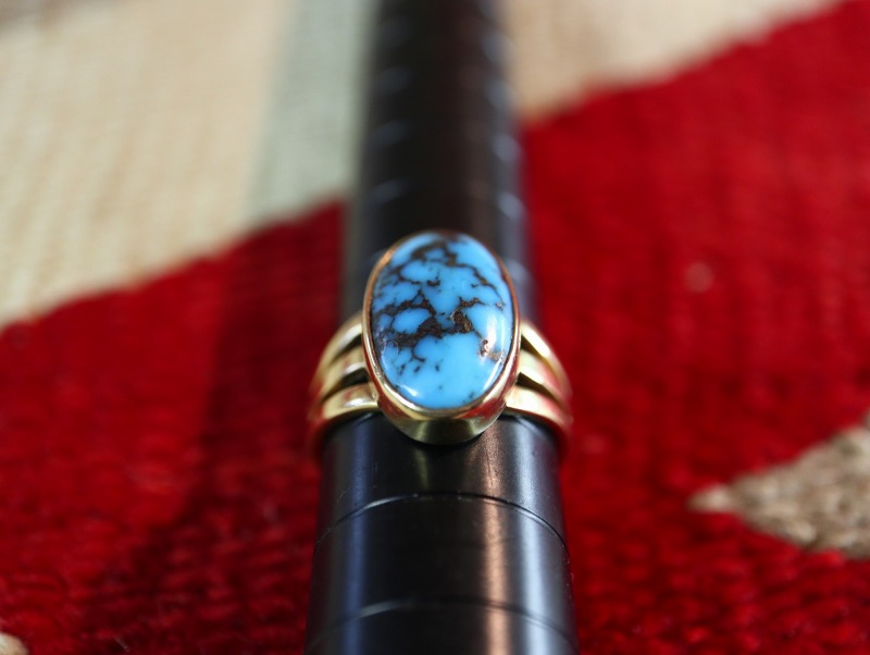 14Kイエローゴールドと深いブルーを湛えるターコイズのコントラストが非常に美しく、ナバホジュエリーの伝統的な技術によってハンドメイドされた武骨でインディアンジュエリーらしい雰囲気と素材の持つエレガントな表情の二面性を秘めた作品となっています。