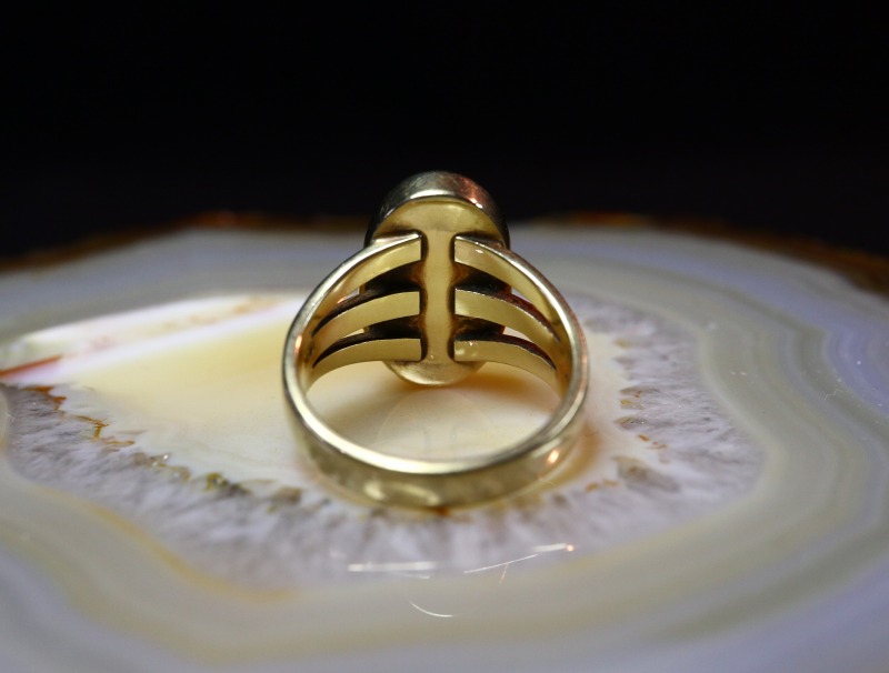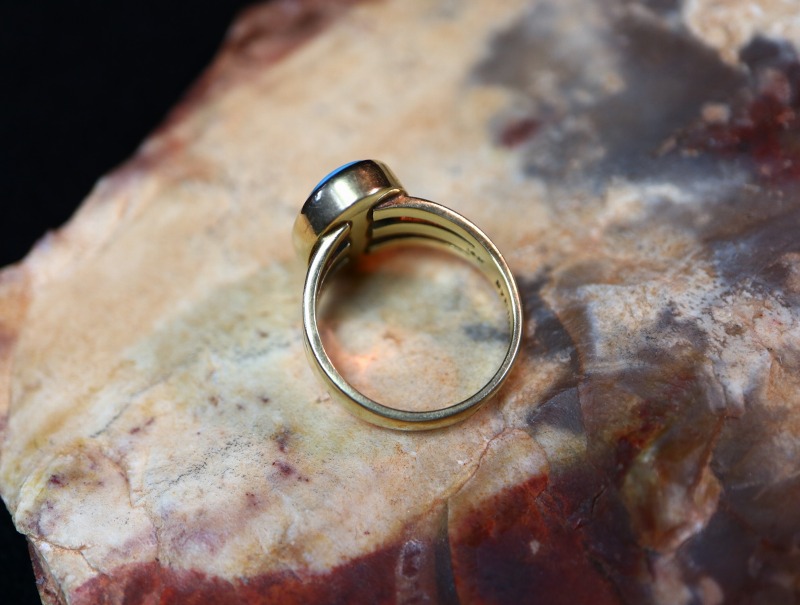 ソリッド14Kゴールド/14金無垢で形作られたシャンク(地金)は、とてもしっかりとした厚みを持ち重厚な仕上がりとなっており、フロントが3本に割り開かれた『スプリットシャンク』と呼ばれるオーセンティックな造形によって、サイドからオーバルシェイプのフェイスに向けて自然な流れを作り出しています。そこに大変美しく質の高いパージャンターコイズがマウントされており、そのベゼル(覆輪)もしっかりと厚みのある14金で構成されています。とてもシンプルなデザインがすべて14金無垢で造形されることで、美しい色彩を持つターコイズの美しさをさらに引き立てているようです。