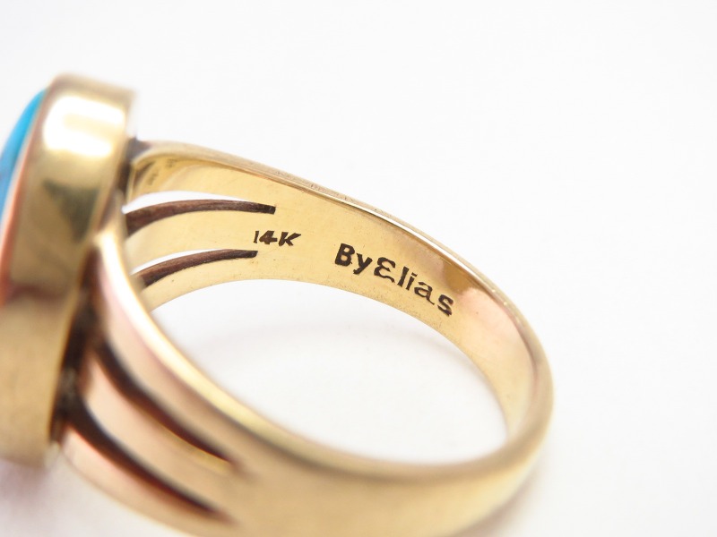 同一のホールマークが施された作品は、本作と同じ14金で作られハイグレードなターコイズがマウントされたナバホスタイルのジュエリーが多く発見されており、それはシルバーのブレスレットもあればベルトバックル等のアイテムも散見されます。ミッドセンチュリー以降にスコッツデールで作られていたという未確認情報もありますが、「Elias」が作者を表しているのか、By・・・という表記のスタイルからショップやデザイナーを表しているのかも断定できません。