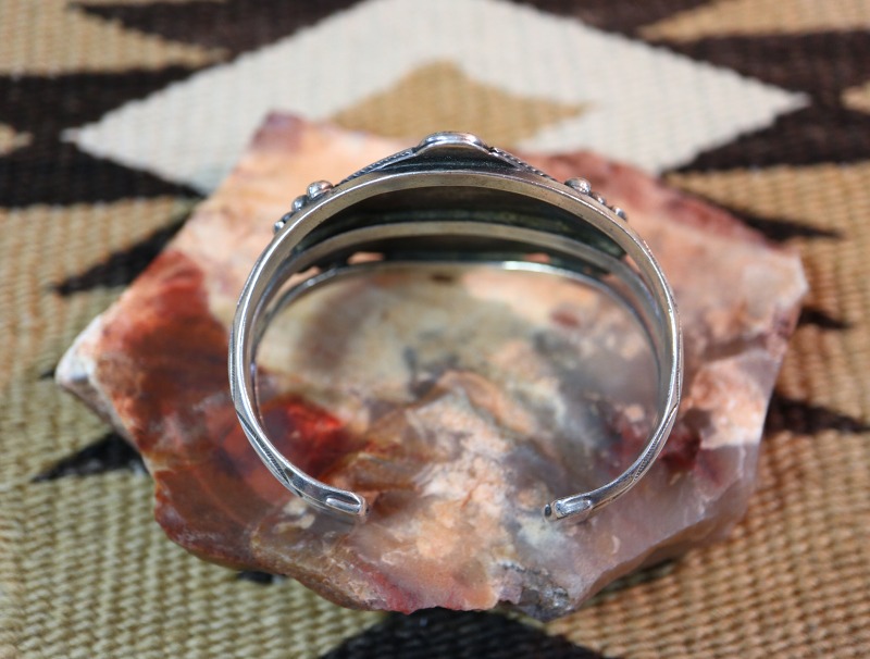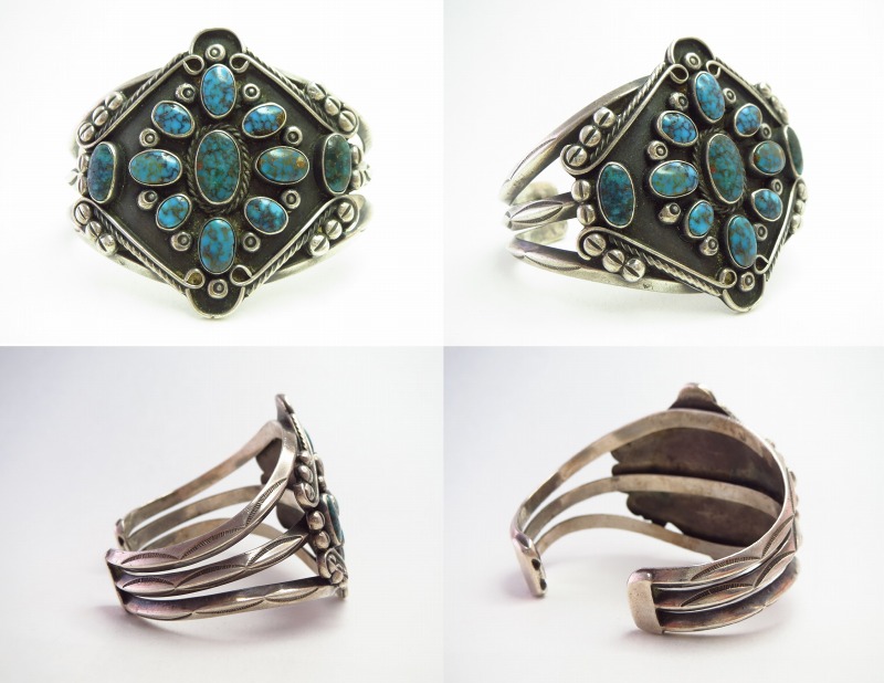 フェイスは、流麗なワイヤーワークによって囲まれた菱形のシェイプとなっています。中央に9つのターコイズによるクラスターデザインが形作られており、その両サイドにも一つずつターコイズが配されています。センターの石には、ベゼル(覆輪)の外側にツイステッドワイヤーが施され、石と石の間や上下には10個ものスタンプワークが刻まれたシルバーボールが配されることでナバホジュエリーらしい奥行きと陰影が与えられているようです。さらに、フェイスを囲むようにライン模様の刻まれた小さなコンチョのアップリケや、単独のスクエアワイヤーを捻ることで作るツイステッドワイヤー等、細部まで手の込んだ細工には、作者の強い拘りと技術力を感じます。