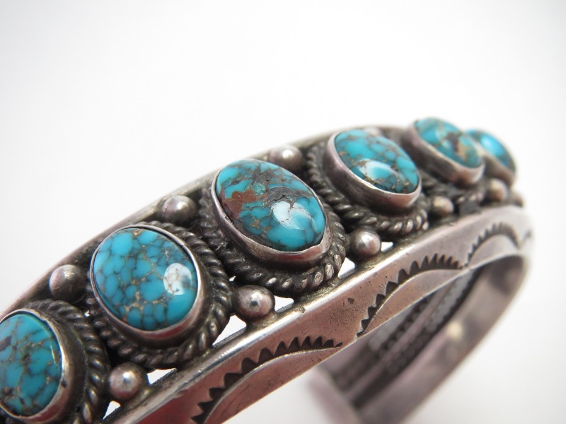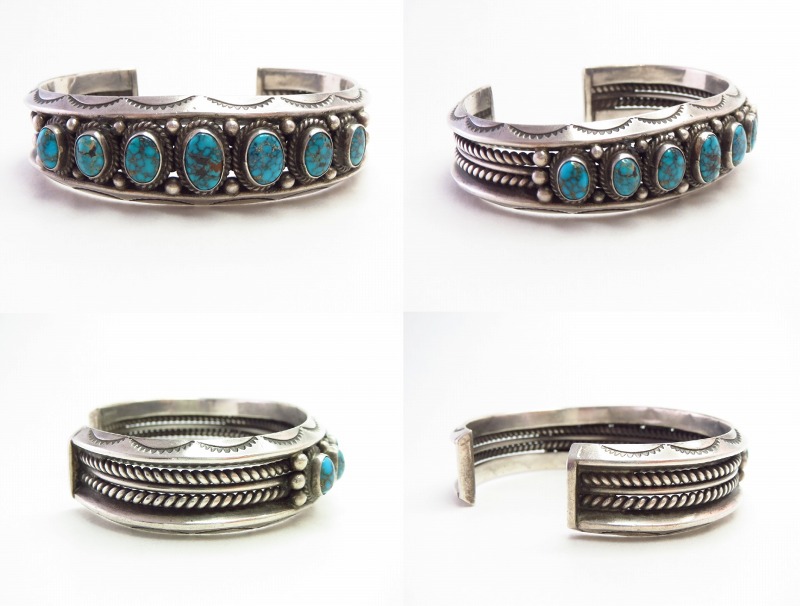 1950年代~1960年代前半頃に作られた作品と思われ、大変重厚なトライアングルワイヤー2本に挟まれるようにターコイズがマウントされています。またそのベースとなっているバンドは、上下のトライアングルワイヤーだけでなく、2本のツイステッドワイヤーと1本のラウンドワイヤーの5連構造となっており、重厚で端正なシルバーワークも特徴的な作品です。さらに、トライアングルワイヤーには力強くスタンプワークが刻まれ、ターコイズのベゼル(覆輪)にはそれぞれツイステッドワイヤーが施されています。そして、石と石の間等には18個もの小さなシルバードロップ/ボールが配されることでナバホジュエリーらしい奥行きと陰影が与えられているようです。