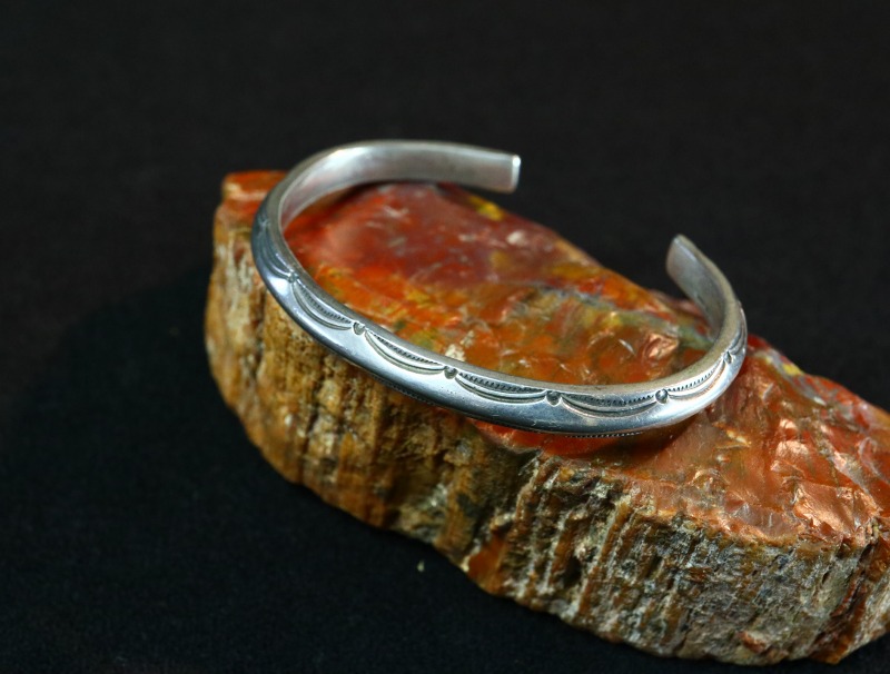 そこに、力強いベイナーデザインのスタンプワークが施され、ナバホジュエリーらしい武骨でシンプルながら味わい深い表情に仕上げられたブレスレットです。