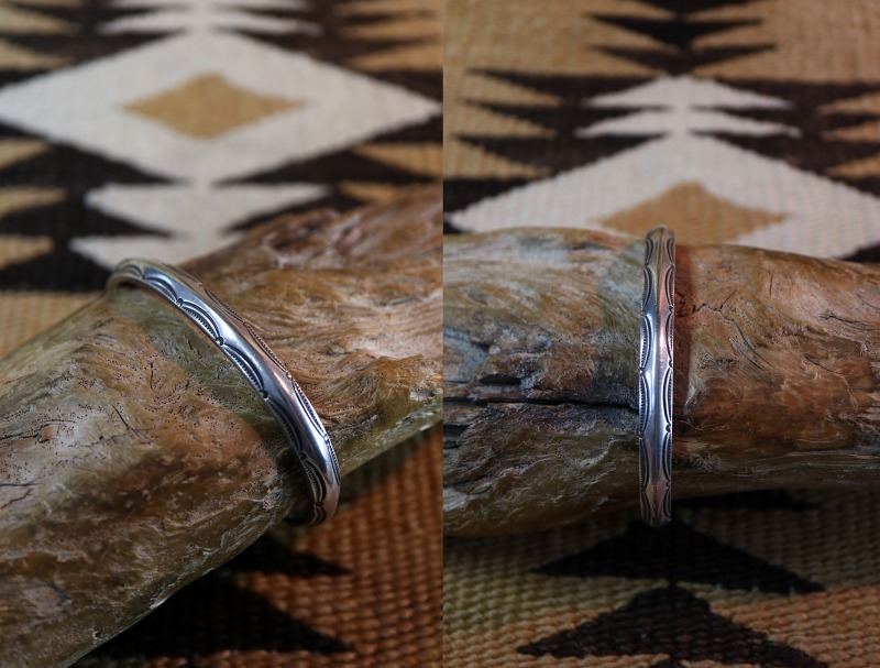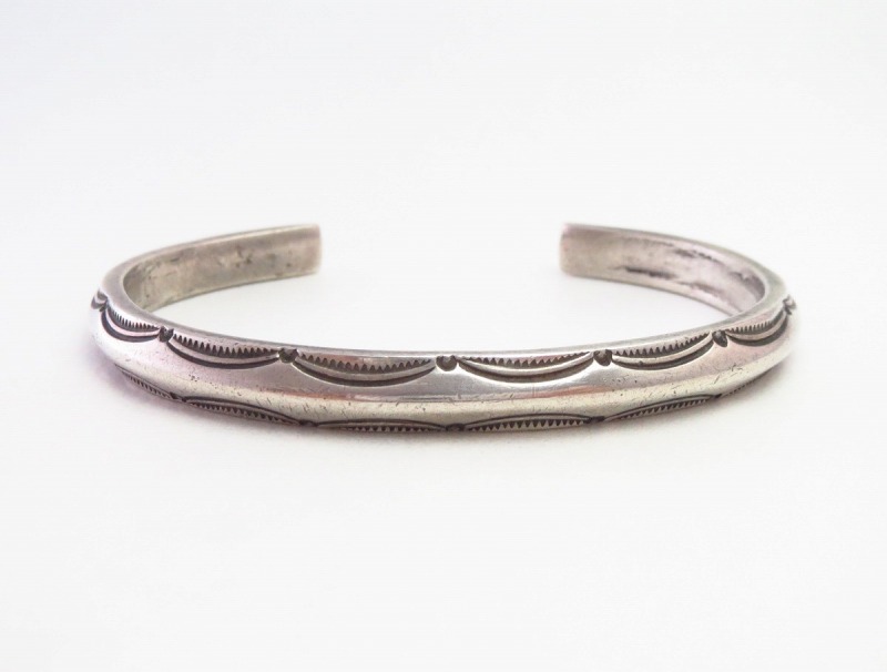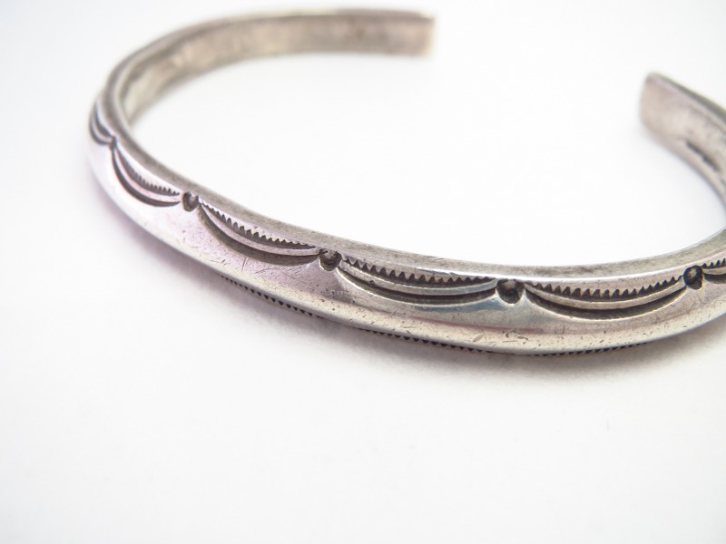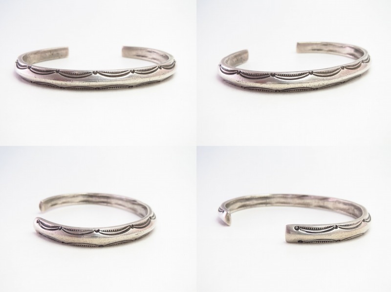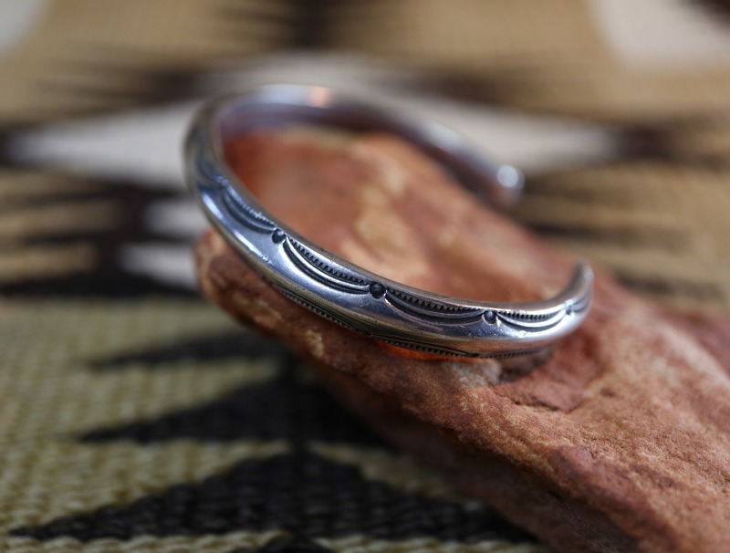 古い製法ならではのバンドシェイプや力強く無駄のないスタンプワークによって、アンティークナバホジュエリーらしいプリミティブな雰囲気とエッジーでクリーンな相反する要素を併せ持っており、独特な上質感も与えられたバングルです。